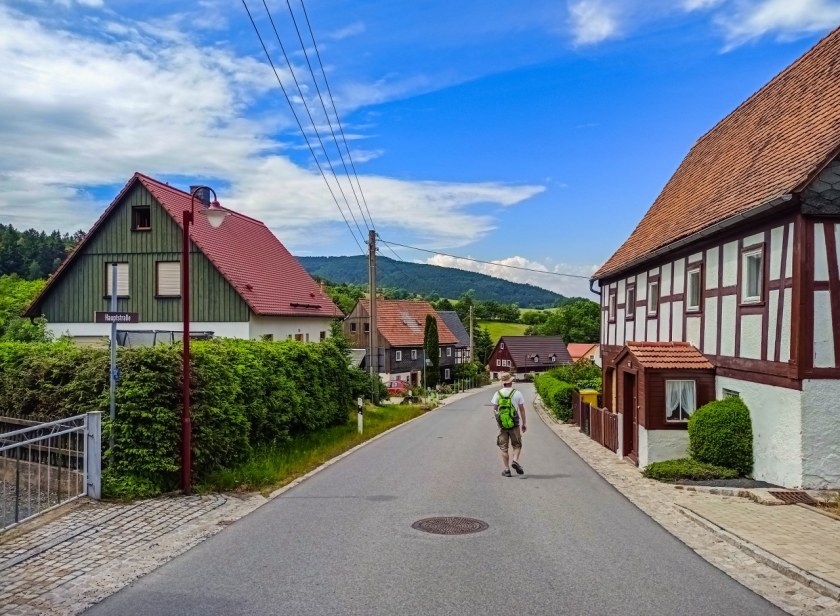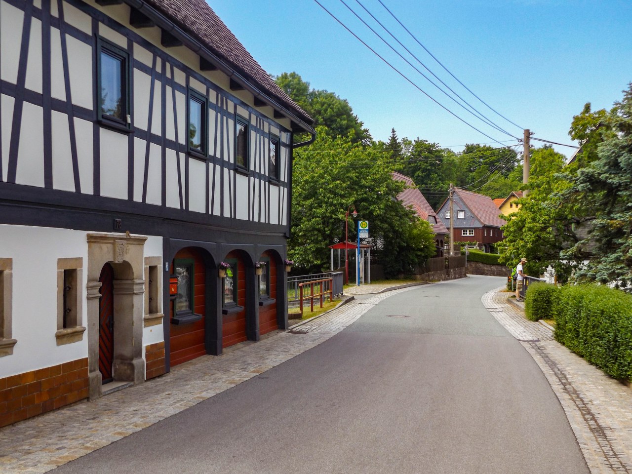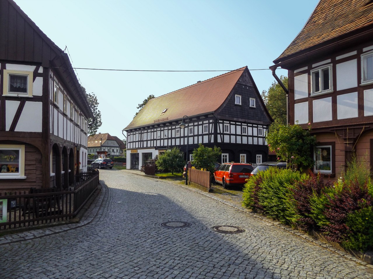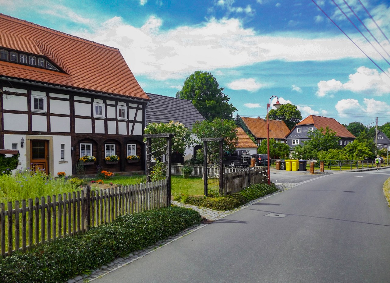 To tuż za kościołem staje się jasne, że dalszy spacer lepiej uskutecznić Dorfstarsse, wzdłuż której usianych jest więcej domów przysłupowych. Choć rzecz jasna możecie mieć ich dość i wybór Hauptstrasse dostarczy wam w zamian kilka ładnych widoków na Góry Łużyckie.