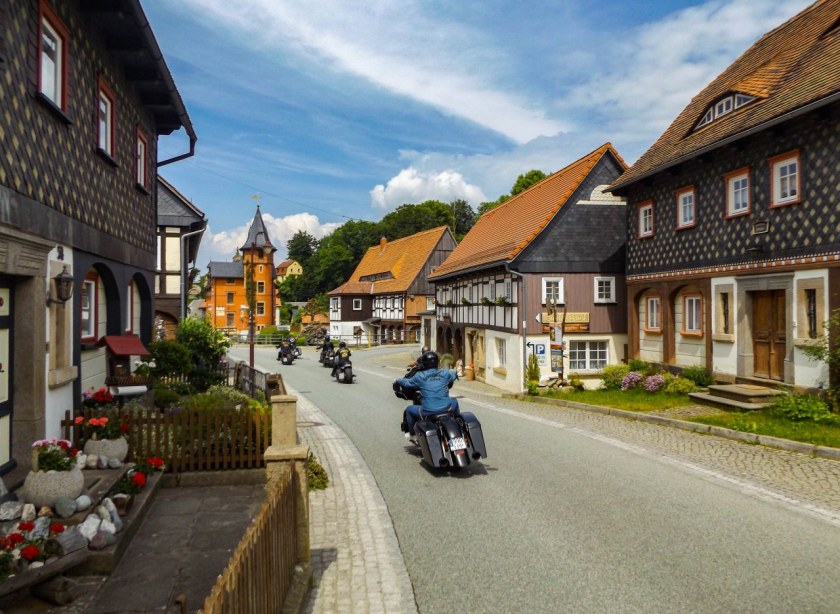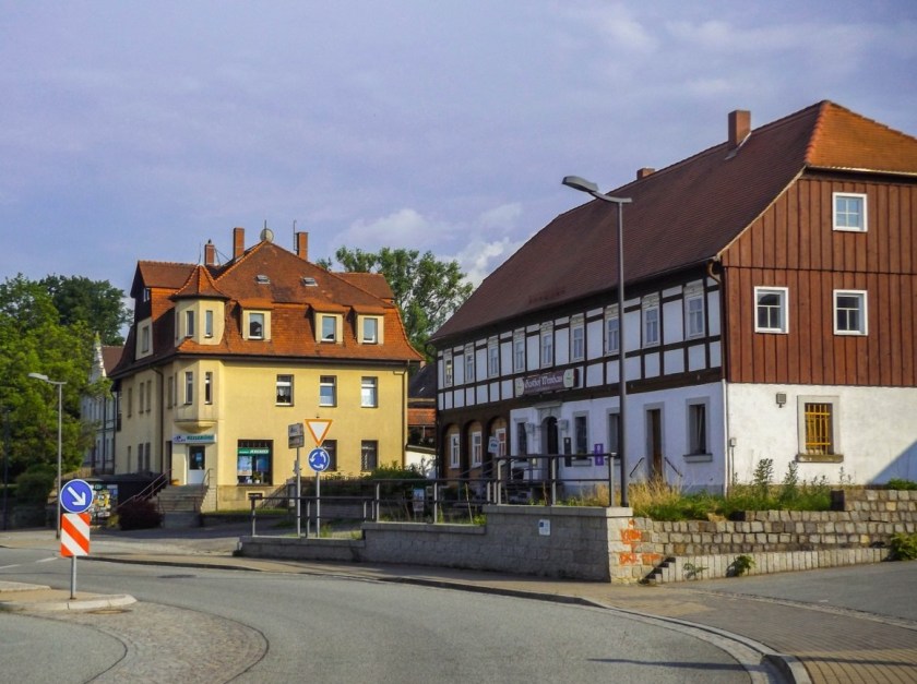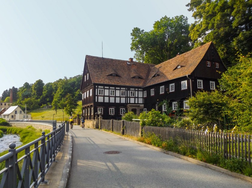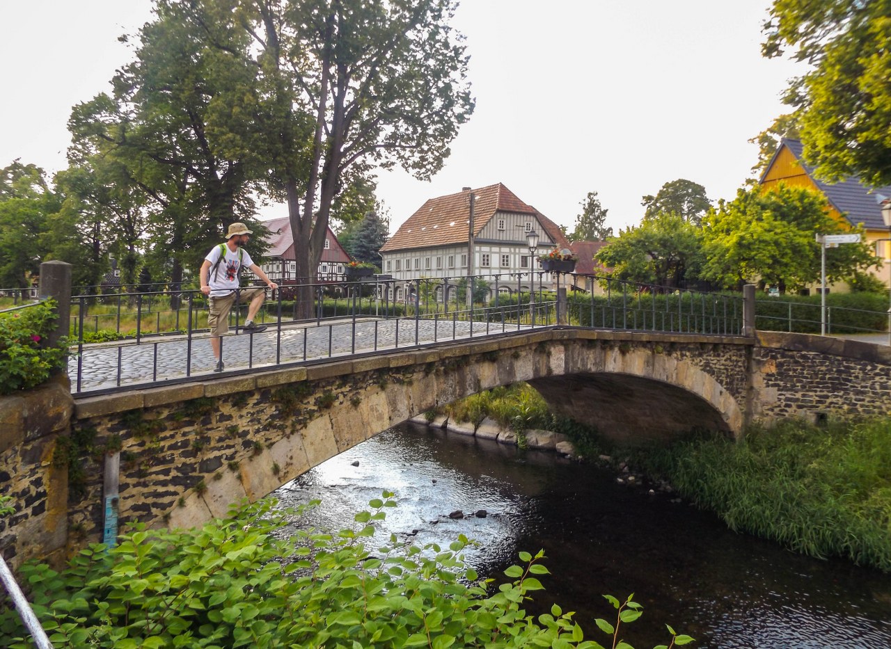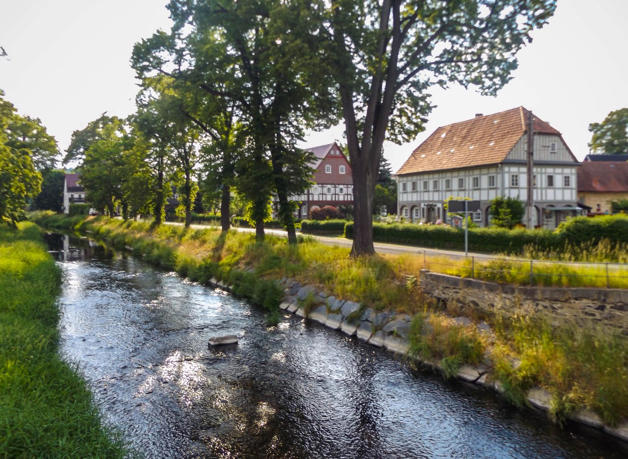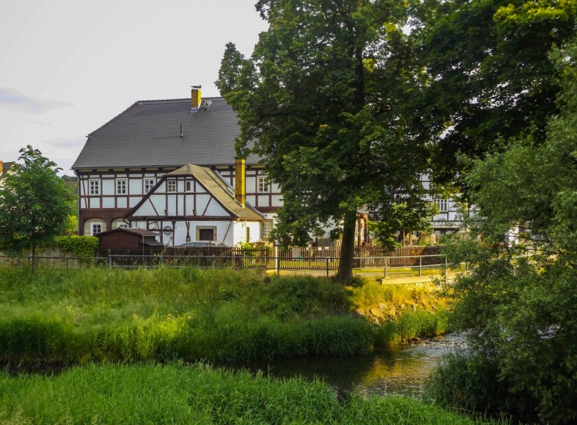 Oczywiście po całym dniu łazęgi byliśmy już po czasie i pocałowaliśmy klamkę dlatego też niedogodność tą przeznaczyliśmy na dalszy obchód miasteczka. A przyznać trzeba, że im dalej w centrum tym bardziej fotogeniczne – domów przysłupowych może i jest mniej niż w Waltersdorf, ale ich skupienie, układ oraz bliskość urokliwej rzeczki Mandau robią TAKĄ robotę, że hoho (elokwencja poziom milion, wiem). No co ja wam powiem, okolice nadrzeczne wspaniałymi są i basta i zaryzykuję stwierdzenie, że w całej gminie najpiękniejsze. Co najważniejsze jednak domy z Waltersdorfu i Großschönau wzięte razem tworzą największy, zwarty zespół przysłupów w całych Łużycach.