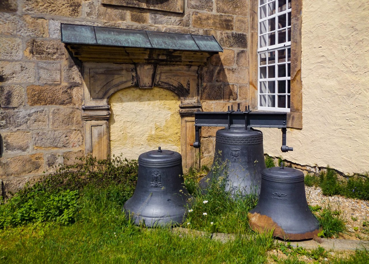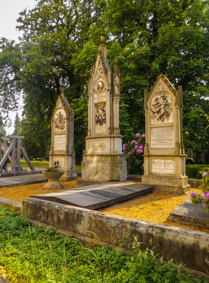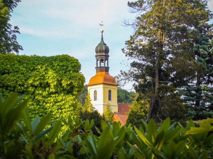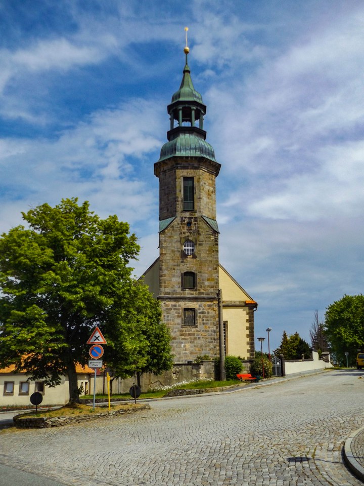 Nieustannie powracającym elementem krajobrazu jest wieża kościoła ewangelickiego, wzniesionego na niewielkim wzgórku. Barokowo-klasycystyczna świątynia była niestety zamknięta więc wnętrz – podobnych do tych w Waltersdorf – nie zobaczyliśmy, przeszliśmy się przeto po otaczającym kościół cmentarzu. Nekropolia jest rozległa i pochowano nań najważniejsze dla miasta osobistości, w tym rodzinę Waentig, jednych z twórców adamaszkowej maestrii osiąganej przez miejscowych rzemieślników.