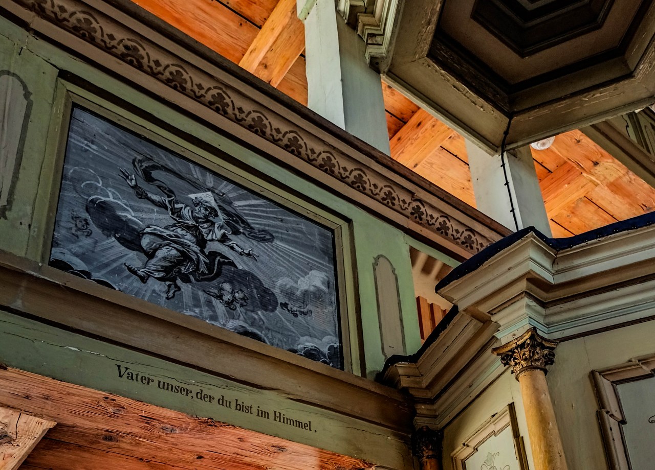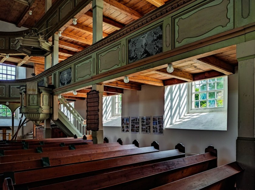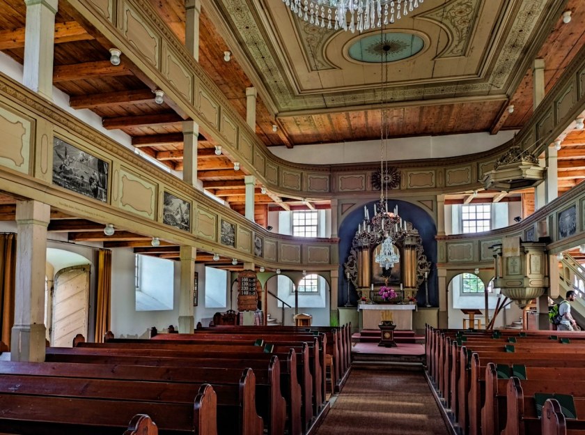 We wnętrzach króluje drewno i rządy są to piękne. Dwa piętra empor pod zdobionym drewnianym stropem od razu zdradzają jego protestancką proweniencję. Niższe piętra ozdobione są obrazami scen z Biblii, wykonanymi w monochromatycznej technice grisaille i czarno-białe obrazy ciekawie kontrastują z resztą barwnych i pełnych Słońca wnętrz. Z drewna jest też ambona i ołtarz. ALE największym skarbem są chyba organy, dzieło żytawskiego mistrza Johana Gotlieba Tamitiusa (twórcy organów dla przeszło 40 górnołużyckich kościołów) i jeśli wierzyć stronie miejscowej parafii, są one jedynymi, które dotrwały naszych czasów w oryginalnej choć kilkukrotnie restaurowanej formie. Tego czy grał na nich najsłynniejszy syn Waltersdorfu – kompozytor Friedrich Schneider – nie wiem, ale wiem, że rzeźbione popiersie mistrza znajdziecie tuż przed budynkiem dawnej poczty.