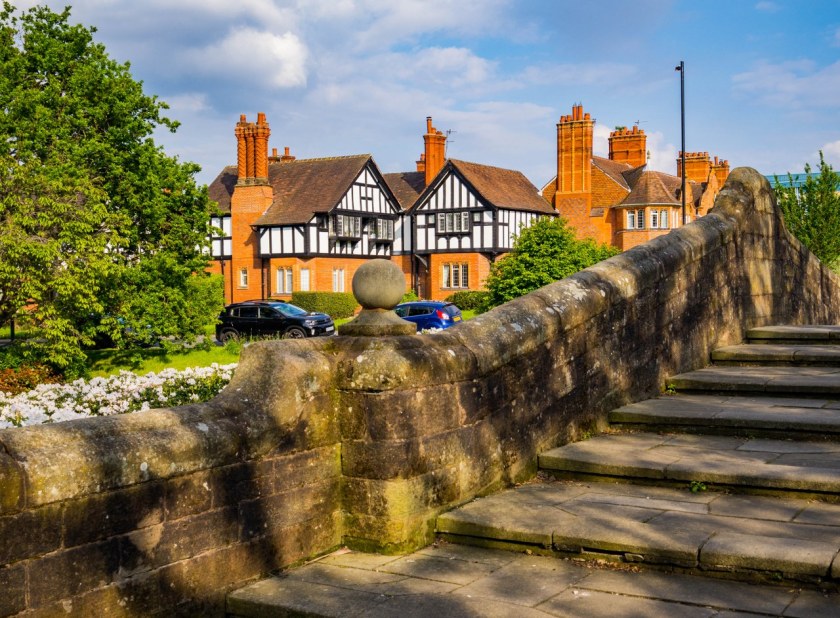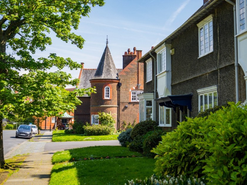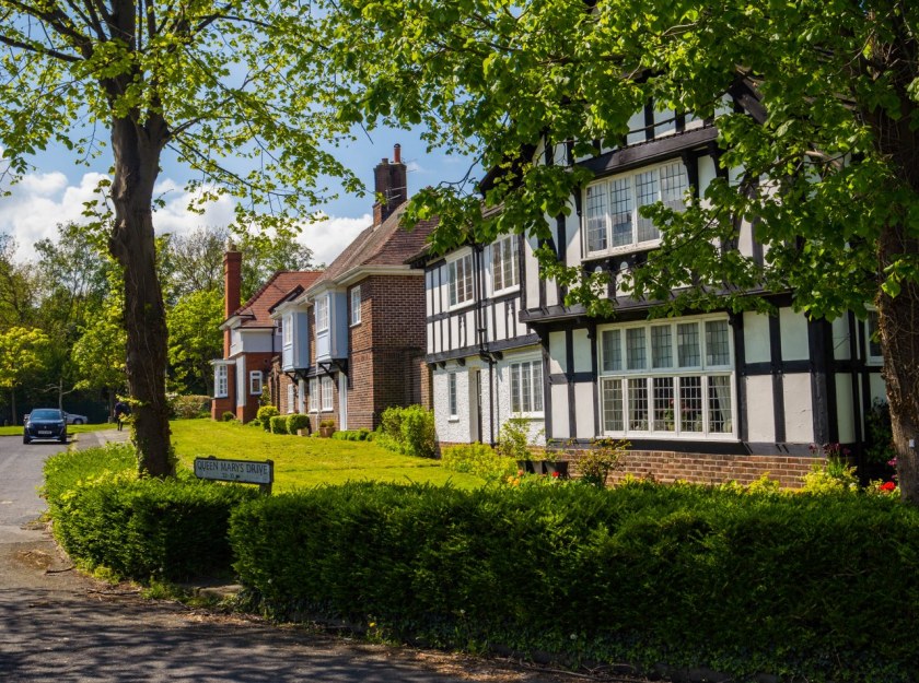 Nie będę udawał, że wybitnie znam się na angielskiej (a raczej brytyjskiej) architekturze i z łatwością przychodzi mi odróżnić styl Królowej Anny od stylu Jakobińskiego a spotykane inspiracje francuskie i flamandzkie są czymś oczywistym. Dla was wszystkich, którzy macie większą wprawę spacer po osiedlu będzie istną zabawą, bo styli jest tu zdecydowanie więcej i z pewnością obserwacja tego eklektycznego – acz trzymanego w ryzach i wydaje mi się harmonijnego – krajobrazu sprawi wam dużo frajdy. Nam laikom też, bo domy są po prostu przecudnej urody. Nie trzeba przecież dyplomu by zachwycić się ceglastą dostojnością romansującą z cudnie nieoczywistymi szkieletowymi fasadami domów, wykuszami z pięknymi oknami czy w końcu wymyślnymi… kominami. Oj tak, te ostatnie bywają bardzo zakręcone.