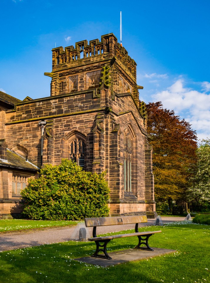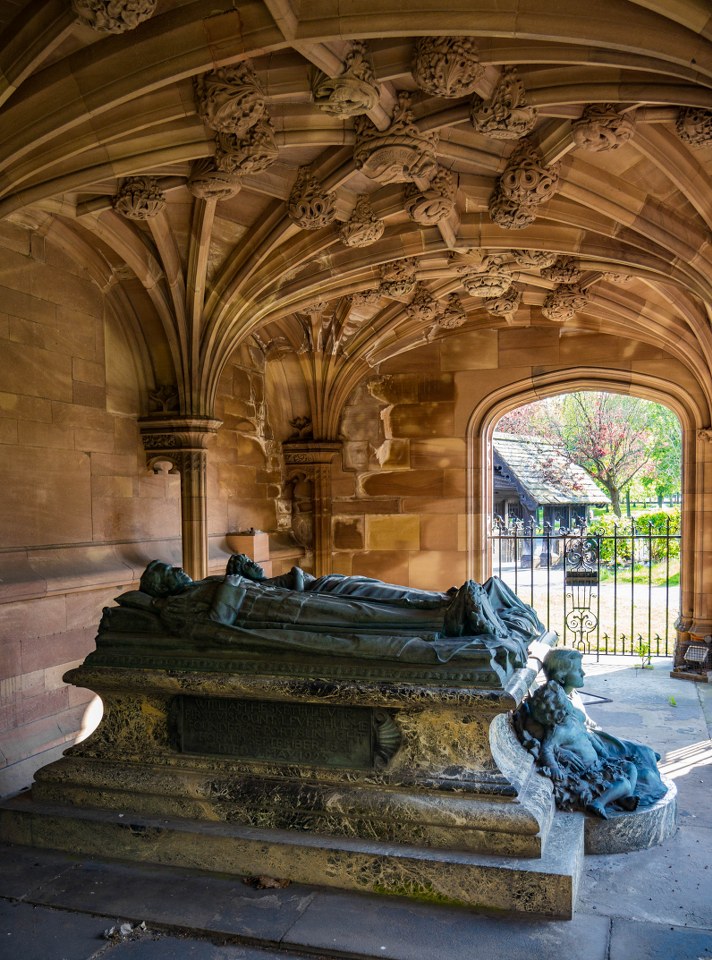 Wspomniany neogotycki kościół Christ Church wybudowano w 1904 roku. Mała acz krępa to świątynia, a jej bryła z miejscowego czerwonego piaskowca pięknie się w popołudniowym Słońcu prezentowała. Wnętrza niestety – z racji godziny – nie zobaczyliśmy, ale i powolny obchód dał nam dużo satysfakcji – wystarczy czerwień piaskowca, transept i chór zwieńczone pinaklami, gargulce czy w końcu najważniejszy element, grobowiec lorda i lady Leverhulme, skrywający pod cudnym sklepieniem brązowe postacie bez których miejsce to nigdy by nie powstało.