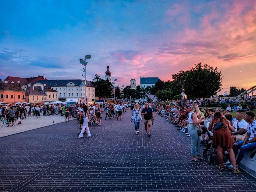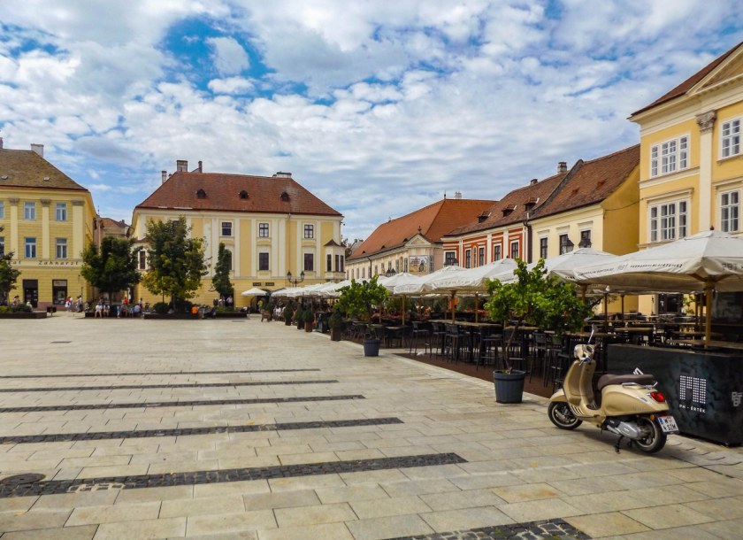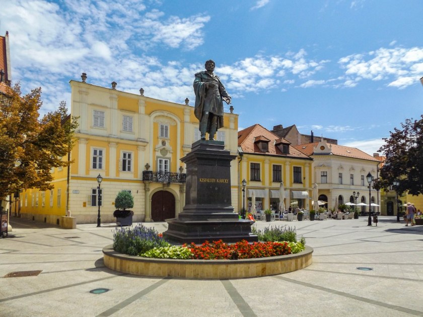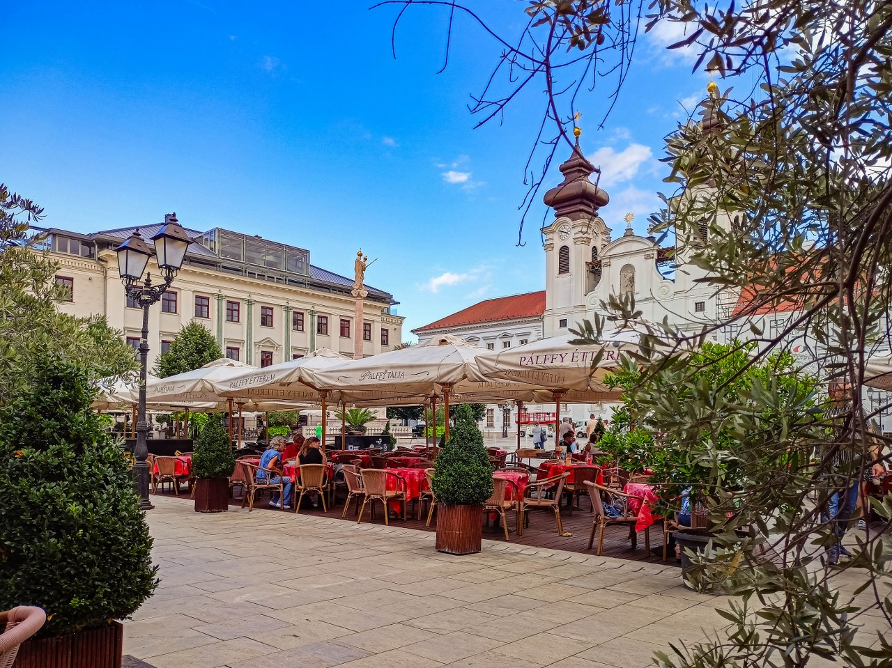 Gdyby Győr miało klasyczny rynek to byłby nim Plac Széchenyiego, chyba najładniejszy w mieście, położony w samiuśkim jego centrum, będący jego sercem. Sercem nad wyraz mocno bijącym i żyjącym, szereg tamtejszych restauracyjek przyciąga turystów jak i miejscowych. Jednak choć plac należy do grupy architektonicznie pięknych to latem jest po prostu PATELNIĄ i w słoneczny dzień większość ludzi przesiaduje w cieniu ogródków piwnych i kilku drzewek.