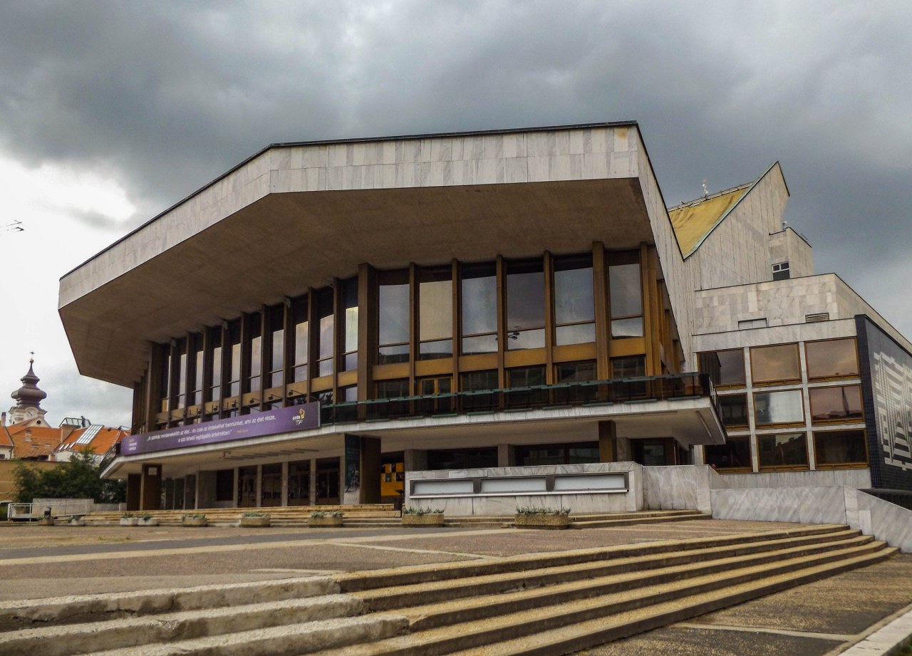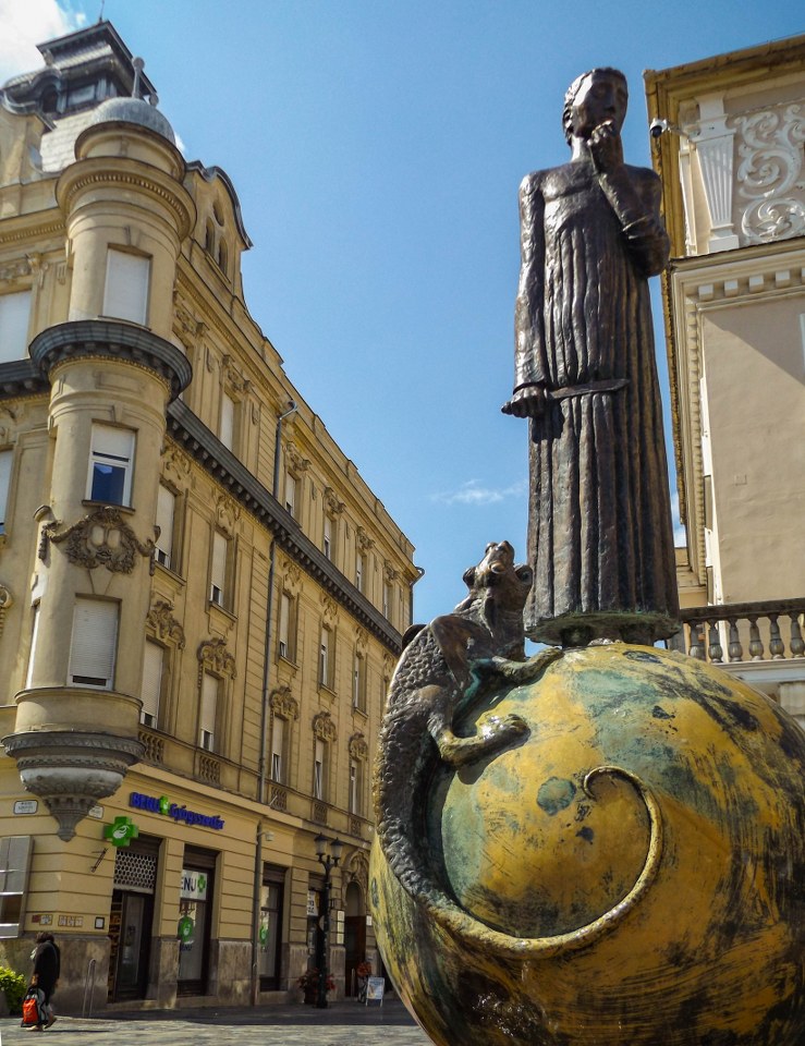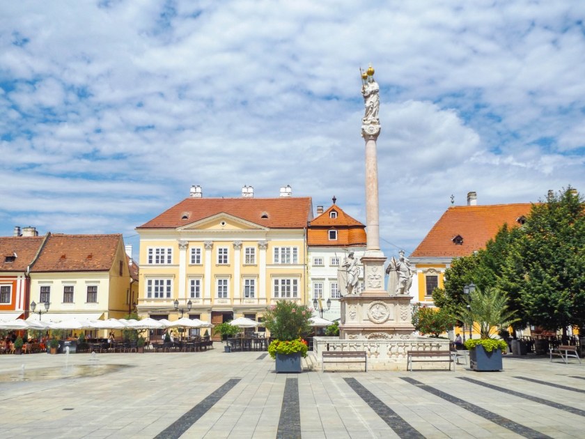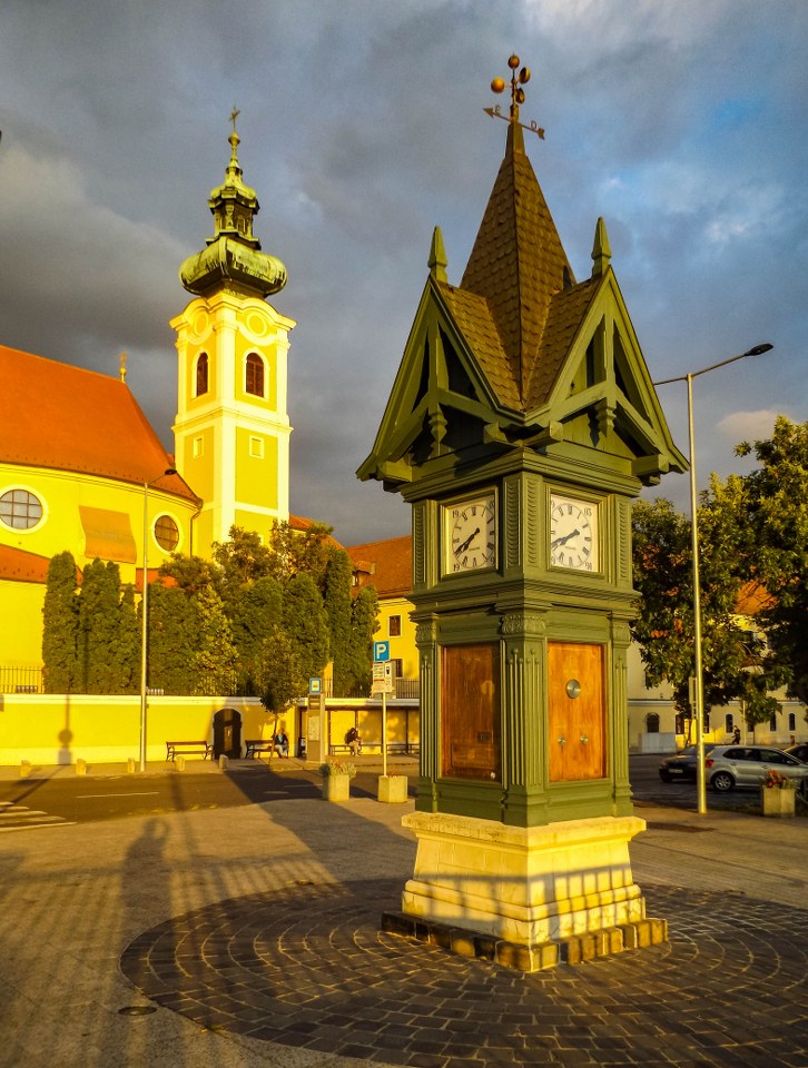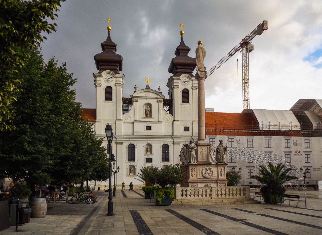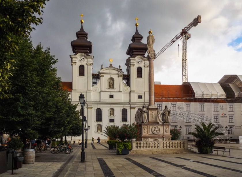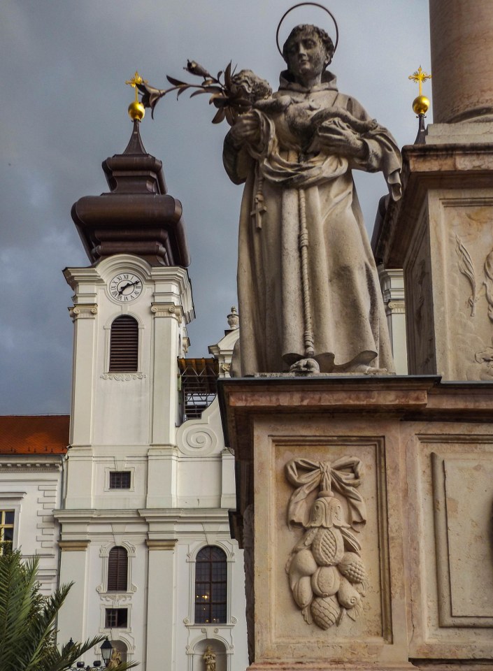 Śródmieście Győr nie jest przesadnie duże, dlatego spod „rynku” szybko możecie zażyć brutalistycznej dawki szokowej w postaci monumentalnego gmachu Teatru Narodowego, rzucić okiem na kolejne ciekawe rzeźby (Człowiek w łódce oraz Święty Jerzy i kameleon… znaczy się smok to must see), odkryć, że nawet i w centrum, zieleń potrafi występować w innej formie niźli „doniczkowej” a w końcu podejść na jeszcze jeden z interesujących placów, pełen barokowego (jakżeby inaczej) dobra.
