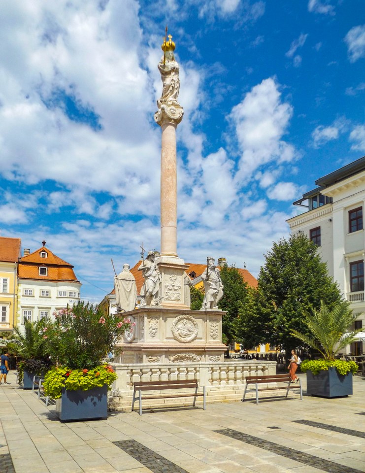We wschodnim fragmencie tej patelni wznosi się klasyczna Kolumna Maryjna, co ciekawe nie jest ona podżumowym wotum dziękczynnym. W roku 1686 ufundował ją miejscowy biskup chcąc w ten sposób uczcić fakt odbicia Budy z rąk tureckich. Bardzo ładna to kolumna, choć jej obecna forma jest efektem niedawnych, dogłębnych prac konserwatorskich. To w cieniu Maryji z Dzieciątkiem przez stulecia odbywały się ważne dla miasta wiece, tu też miejsce miały jarmarki wszelakie.