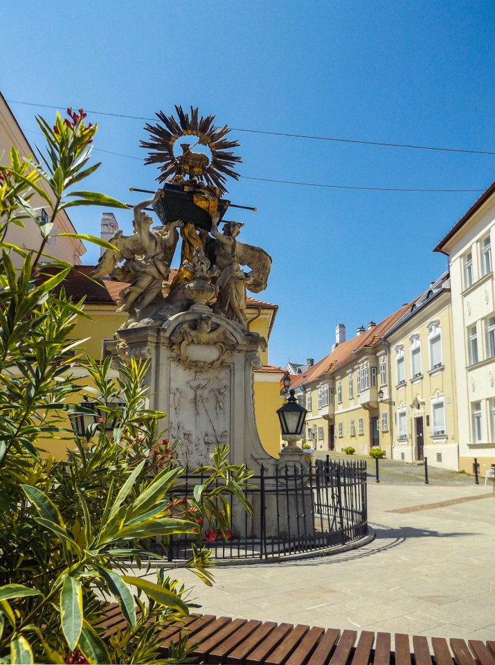 Wprawne oko na pierwszy zdjęciu dojrzy stojącą po sąsiedzku rzeźbę Arki Przymierza, kolejną barokową pieczątkę kryjącą za sobą ciekawą historię. Znajdziecie w niej bigamię, dezercję, procesję mającą dezerterowi pomóc, bójkę, profanację Najświętszego Sakramentu, wielki żal i pokutę samego cesarza Karola VI Habsburga. Rzeźbę zwieńczoną dwoma aniołami niosącymi Arkę nad, którą w blasku „lewituje” baranek Boży wzniesiono w roku 1731 i jest to chyba jeden z najpiękniejszych monumentów jakie znajdziecie w Győr.