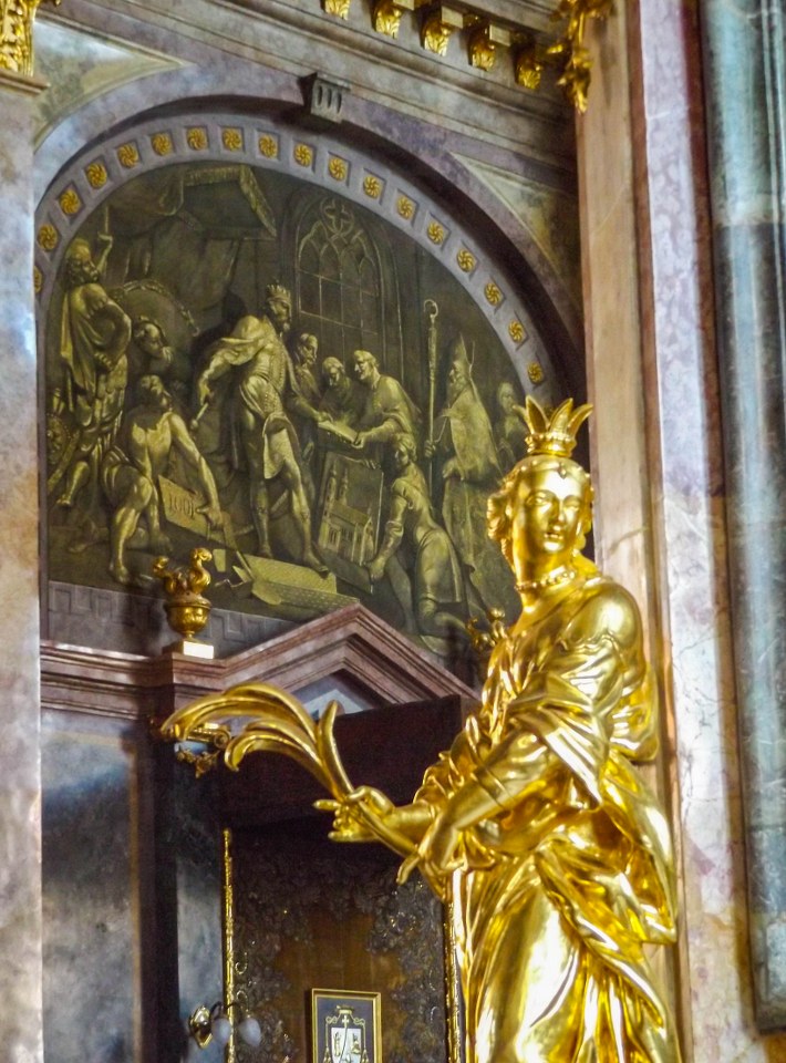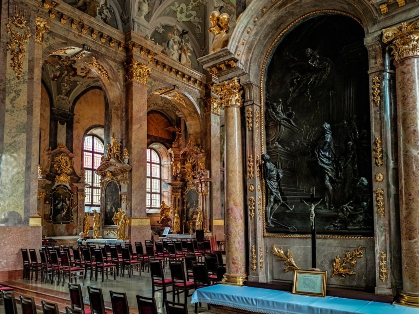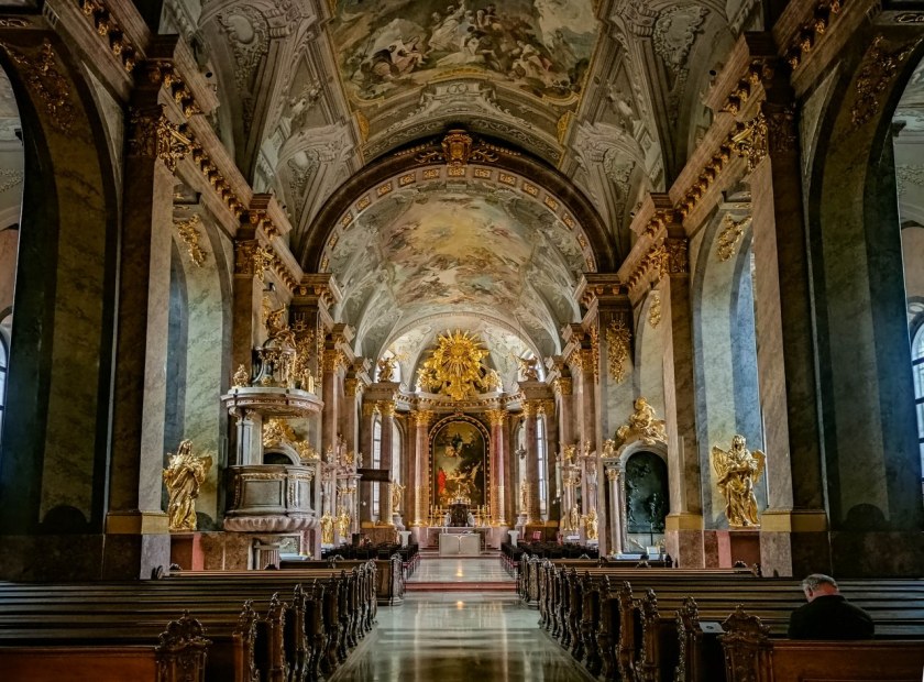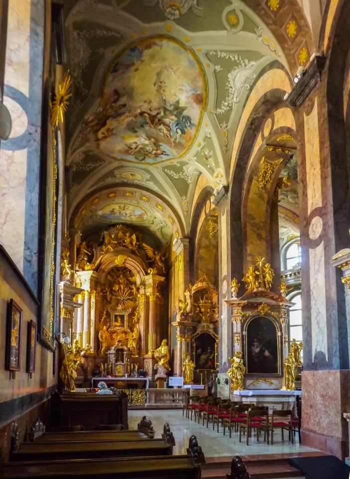Jeśli ktoś uważa, że barokowe wnętrza potrafią przytłaczać mnogością dekoracji i wystroju to tutaj z pewnością rozboli go głowa, jeśli jednak bogactwo zdobionych ołtarzy, pozłacanych rzeźb, wszechobecnych marmurów czy polichromii wam nie straszne to będziecie zachwyceni. Autorem większości malowideł na ścianach i sklepieniach jest Franz Anton Maulbertsch i o rety, jakaż gargantuiczna musiała być to praca: elementy iluzjonistyczne, czarnobiałe grisaille nawiązujące do historii katedry, fragmenty z Biblii czy w końcu wielkie przedstawienie węgierskich świętych. Zwróćcie też uwagę na ołtarze, tak główny jak i boczne (te nawet bardziej), w tym dwa czarne rzeźbione i jeden przybyły z XVII-wiecznej Irlandii.