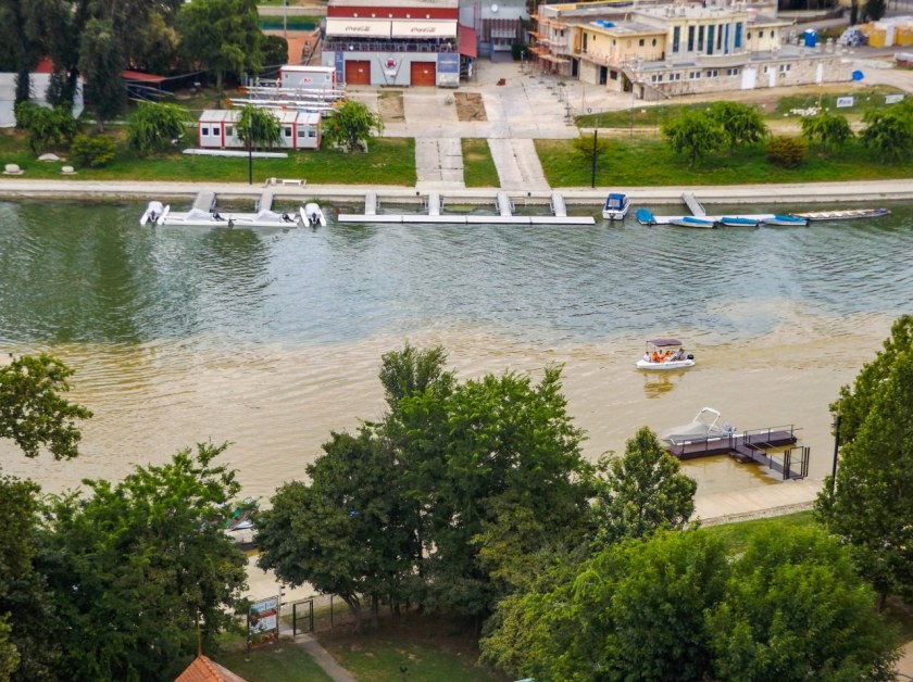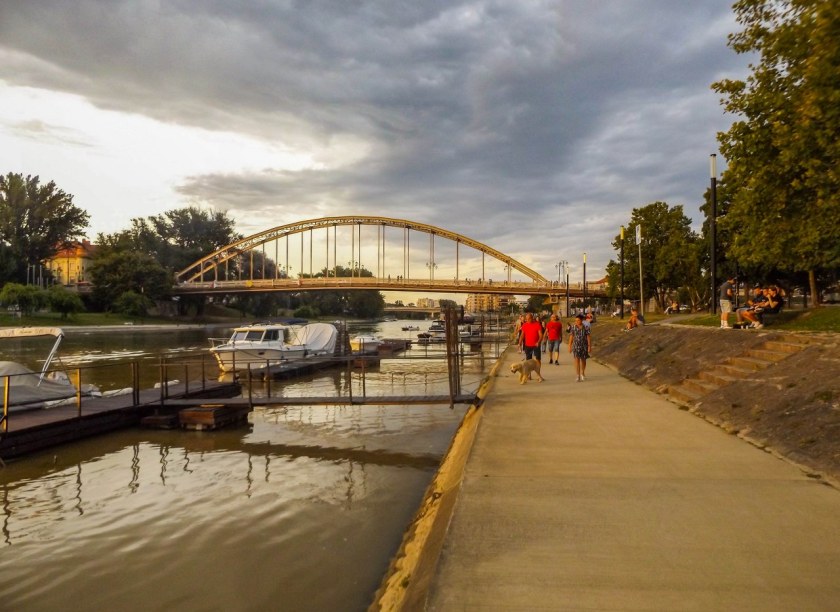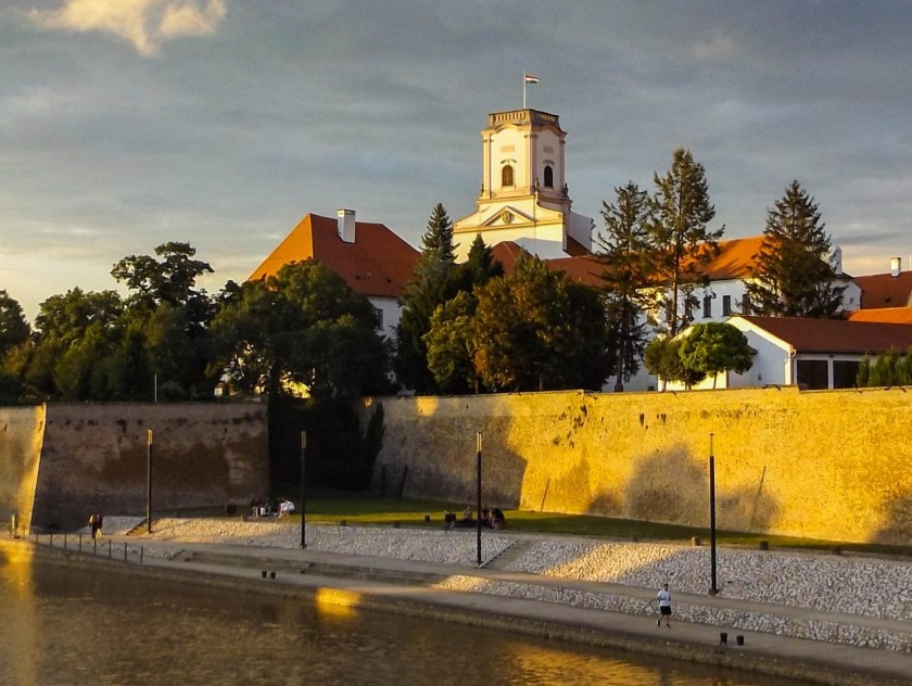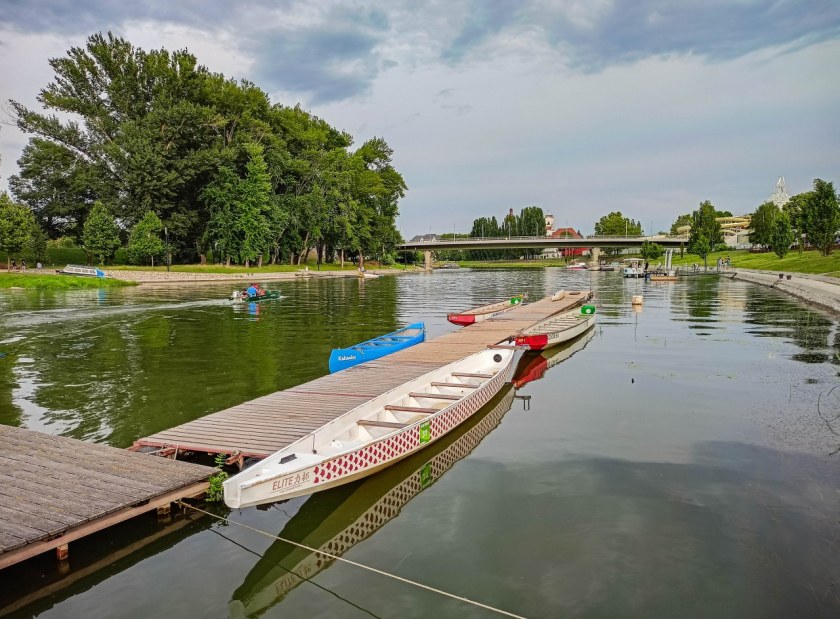 Nadrzeczne położenie przez stulecia przynosiło miastu korzyści z handlu, dziś rzeki służą głównie za miejsce do relaksu i odpoczynku oferując całkiem sporo zieleni, tak nieobecnej w Śródmieściu. Paradoksalnie najbardziej imponujący fragment, chwilę przed miejscem gdzie spotykają się wody Ráby i Dunaju Moszońskiego jest tej zieleni pozbawiony, ale wysokie mury w popołudniowym słońcu potrafią zrekompensować tę niedogodność. Co ciekawe, podczas mojej wizyty Rába była niesamowicie mętna i w miejscu spotkania z Dunajem doskonale było widać granicę między obiema rzekami. Ciekawe czy to częsta sytuacja?