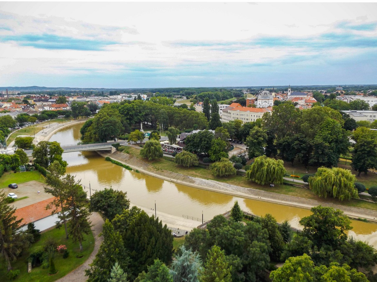 Z wieży rozciąga się dość kapitalny widok na miasto, Śródmieście jak i zachodnią część, mniej turystyczną, ale jak się okaże też wartą choć krótkiego spaceru. Przede wszystkim jednak w oczy rzucają się spotykające nieopodal rzeki, Rába i Dunaj Moszoński. To dobra chwila na kilka słów o miejscowych rzekach.
