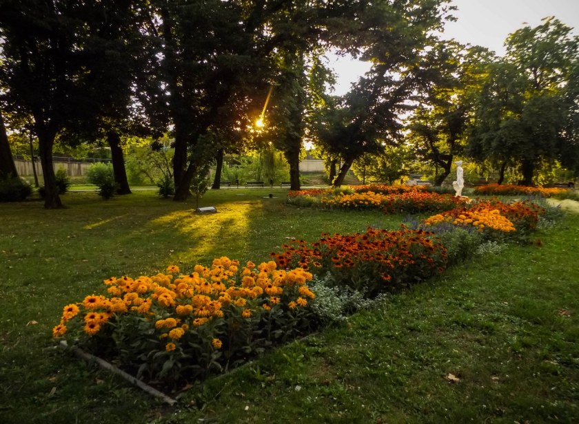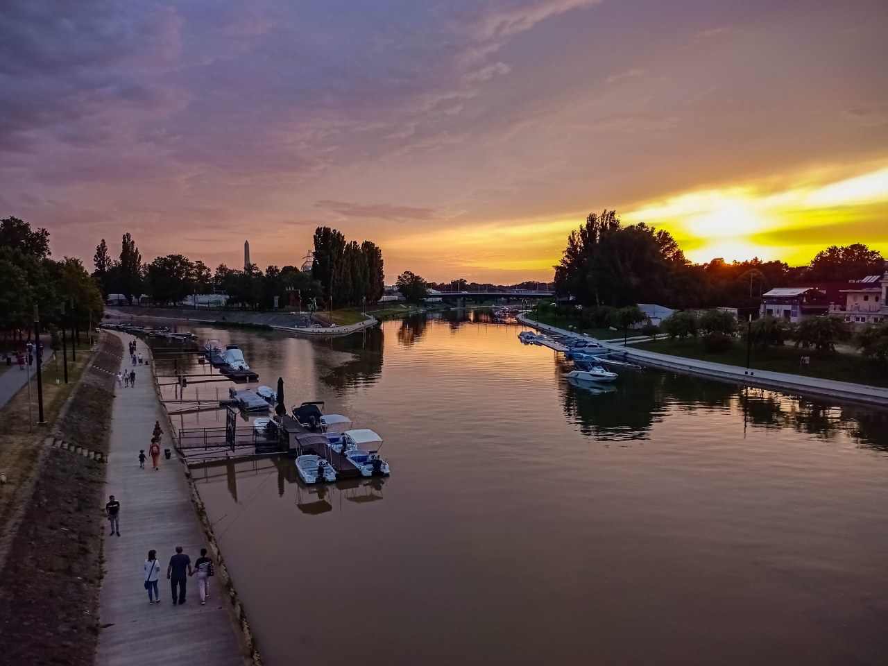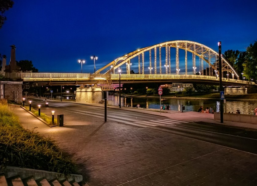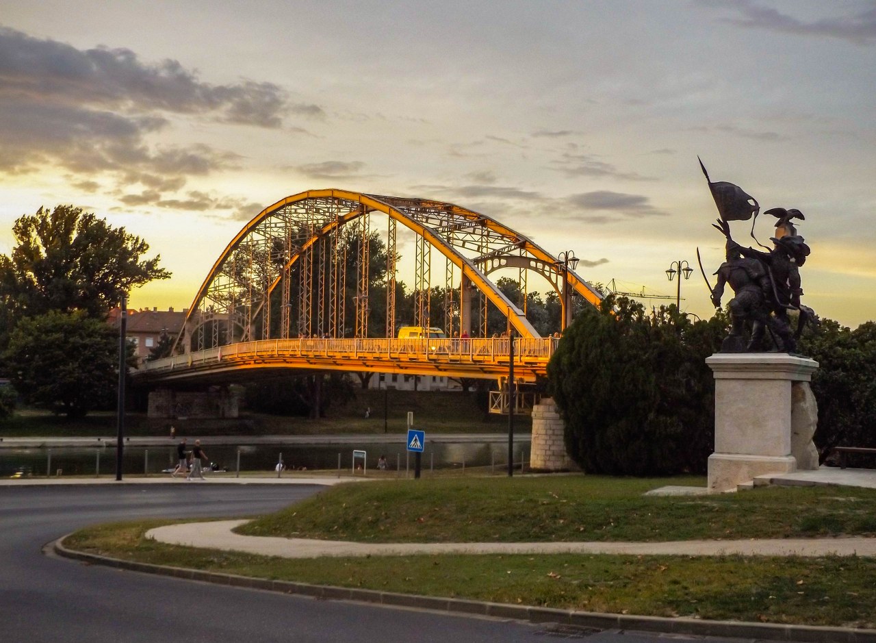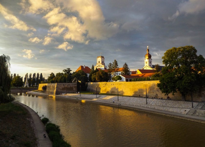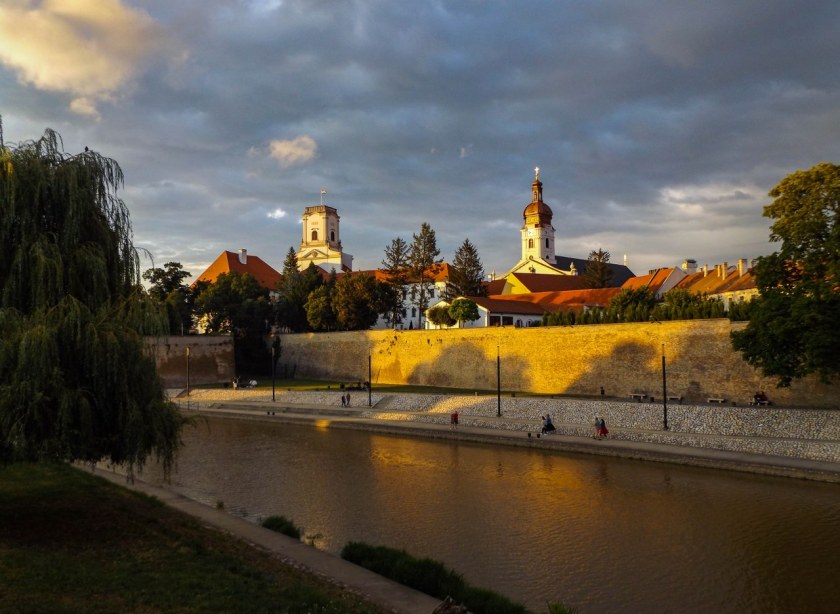 Trochę naokoło, ale w końcu jesteśmy. Jeśli szukacie dobrego miejsca na zachód Słońca to okolice placu Bramy Wiedeńskiej, fragmenty mostu doń prowadzącego oraz kawałek nadrzecznej promenady rozciągającej się wzdłuż Raby są tu dla was. Ten kawałek Győr, pozbawiony od zachodu bariery w postaci w miejskiej zabudowy pozwala popołudniowemu Słońcu zaszaleć i w ciepłym świetle wszystkie barokowe kamienice, kościół Karmelitów czy w końcu pozostałości po miejskich murach, potrafią zaprezentować się zjawiskowo.