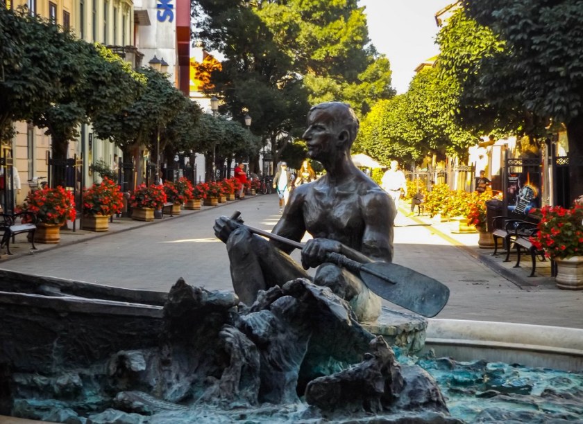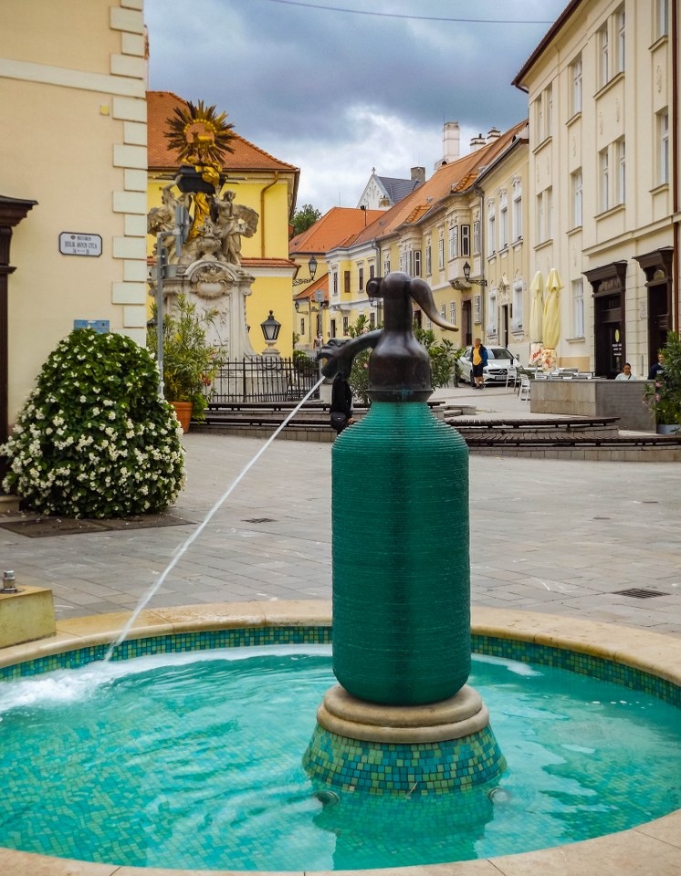 A skoro o wodzie sodowej i fröccsu mowa to wiecie, że w Győr ostatnie lata swego życia spędził twórca przełomowego wynalazku z ową wodą związanego? Mowa o benedyktyńskim mnichu, ale i wynalazcy Anyosu Jedliku, który w 1826 wymyślił, opracował i stworzył niezwykle ważne novum, a mianowicie syfon! Mnich być może i opracował silnik na prąd stały, może i jako pierwszy opisał zasadę pracy dynamo, ale to syfon a wraz z nim fröccs są największym jego dziedzictwem. Nic więc dziwnego, że w mieście jego wynalazek jest uhonorowany. I to jak, w postaci zjawiskowej, quasi secesyjnej fontanny. Postać syfonu ma też… budynek zjeżdżalni w miejscowych termach 😀