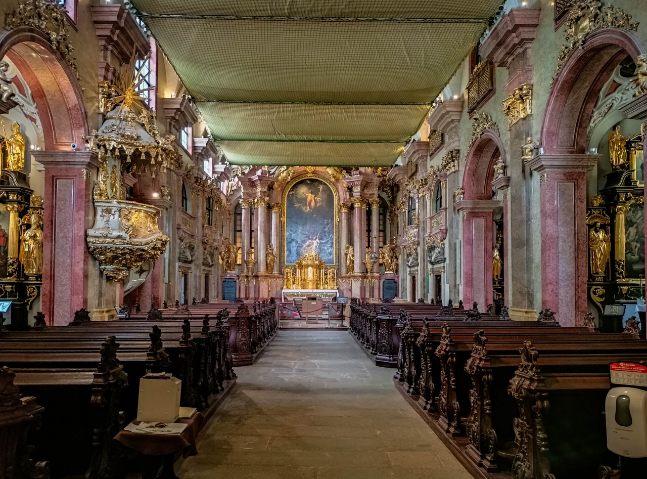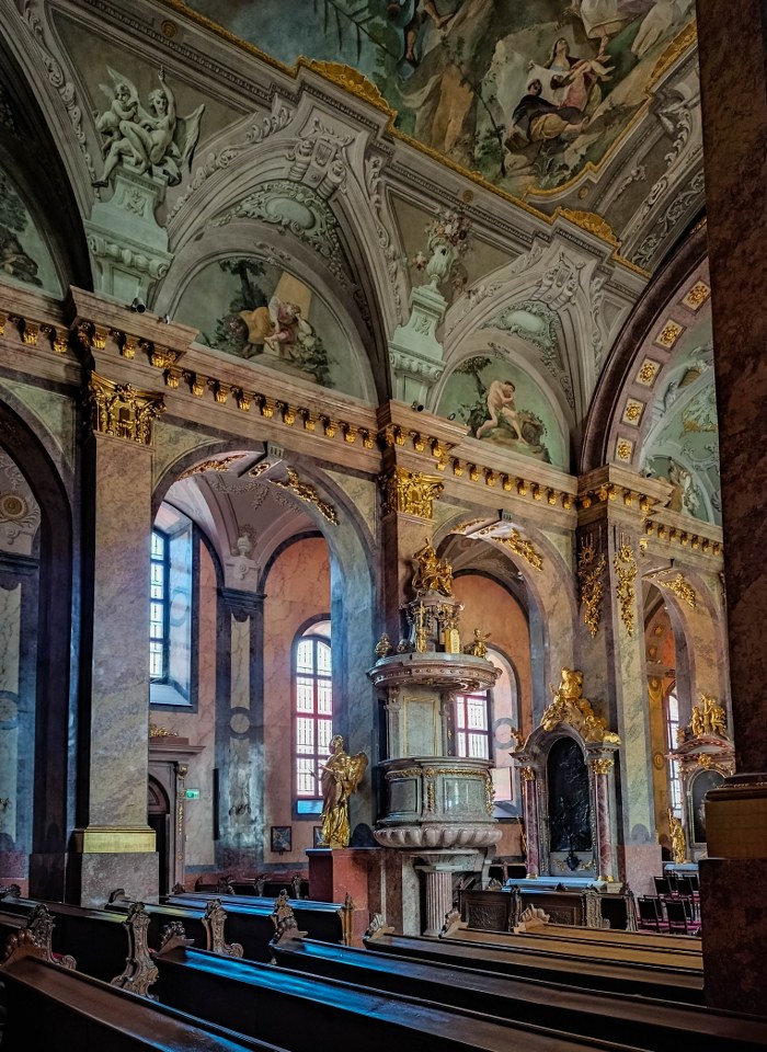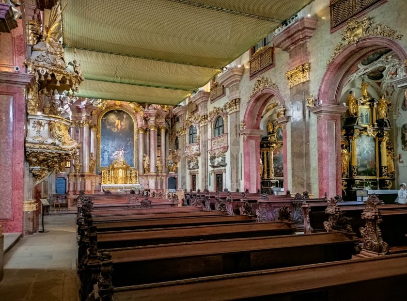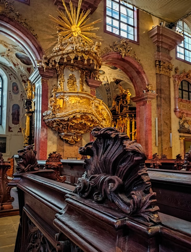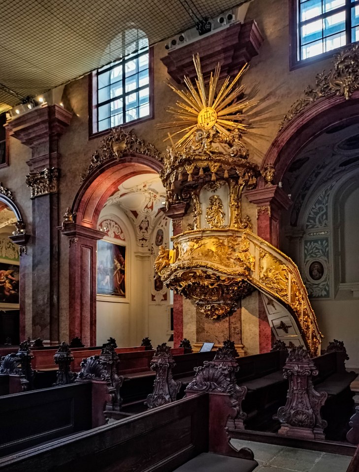 Jakkolwiek fresków wielkiego austriackiego mistrza nie zobaczyłem, tak nic nie stało na przeszkodzie by podziwiać Apoteozę Św. Ignacego zdobiącą Ołtarz Główny świątyni. Ołtarze w ogóle robię niesamowite wrażenie a te boczne – jeśli wierzyć źródłom wszelakim – należą do najstarszych barokowych ołtarzy w całym kraju. Złocone, z mnóstwem ornamentów, rzeźbionych postaci, znajdujące się w kapliczkach o sklepieniach rozmachem nie odstępujących ołtarzom. Kunszt rzemieślników odnajdziecie również na ambonie czy ławach kościelnych, ozdobionych motywami morskimi, najbardziej rzucający się w oczy element z jednej strony przypomina muszlę, z drugiej falę.