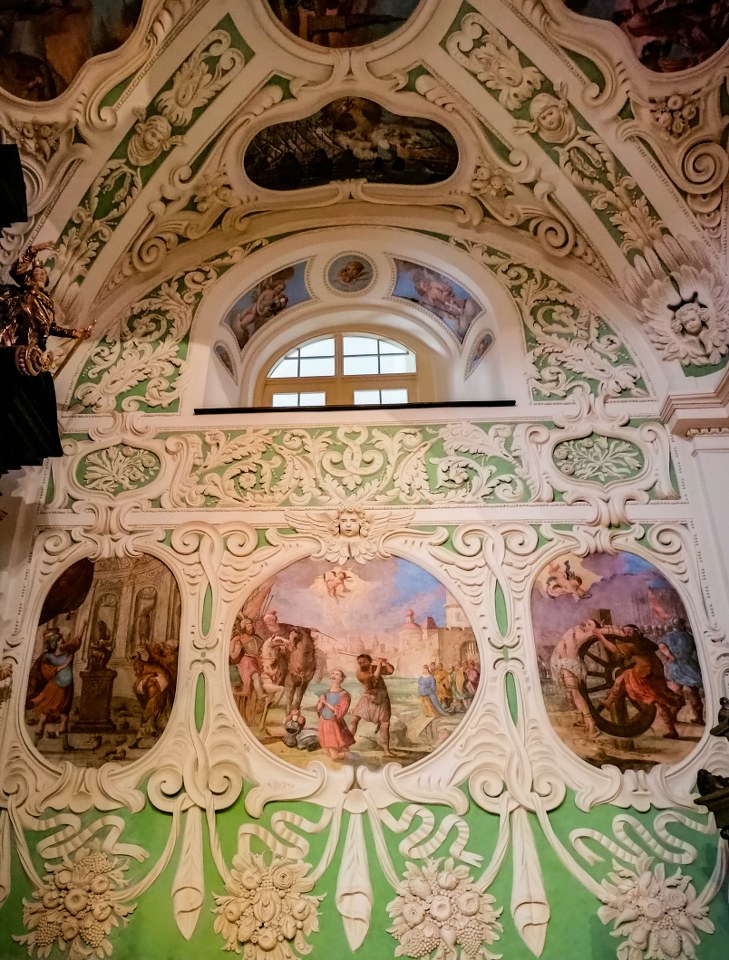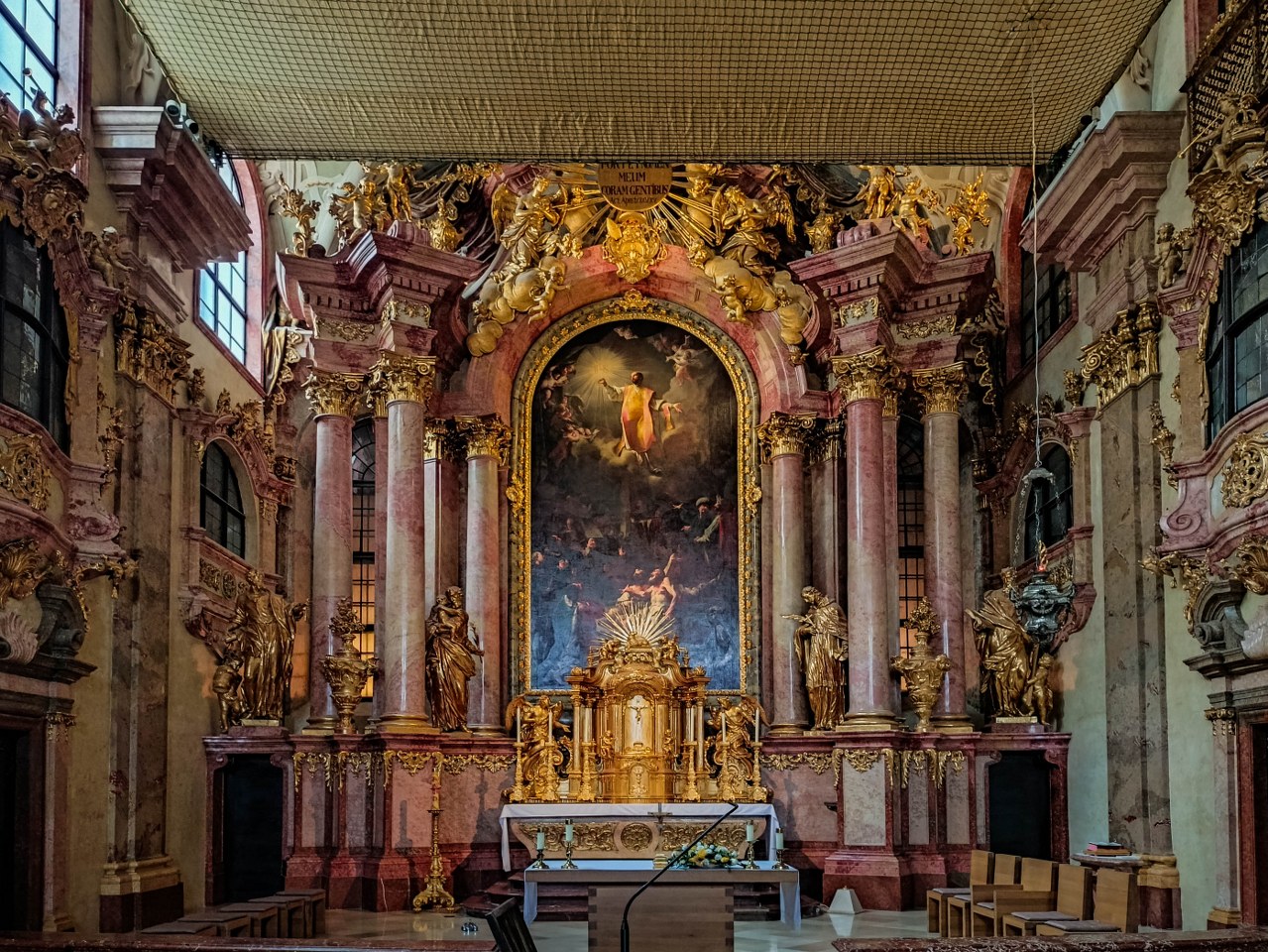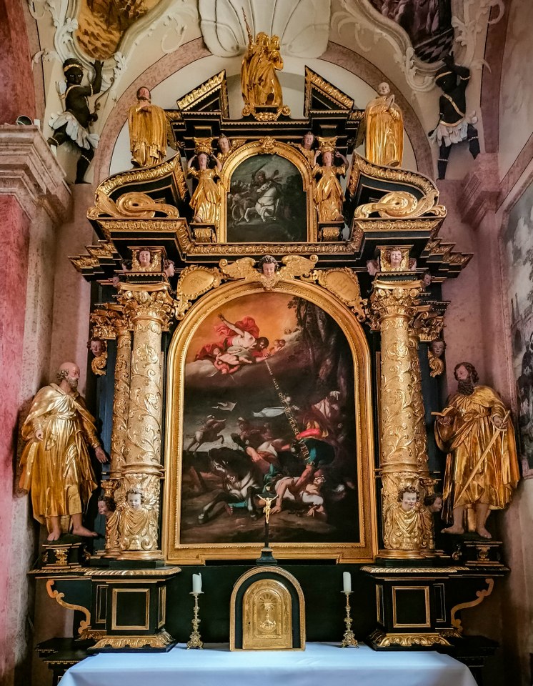 Jakkolwiek fresków wielkiego austriackiego mistrza nie zobaczyłem, tak nic nie stało na przeszkodzie by podziwiać Apoteozę Św. Ignacego zdobiącą Ołtarz Główny świątyni. Ołtarze w ogóle robię niesamowite wrażenie a te boczne – jeśli wierzyć źródłom wszelakim – należą do najstarszych barokowych ołtarzy w całym kraju. Złocone, z mnóstwem ornamentów, rzeźbionych postaci, znajdujące się w kapliczkach o sklepieniach rozmachem nie odstępujących ołtarzom. Kunszt rzemieślników odnajdziecie również na ambonie czy ławach kościelnych, ozdobionych motywami morskimi, najbardziej rzucający się w oczy element z jednej strony przypomina muszlę, z drugiej falę.