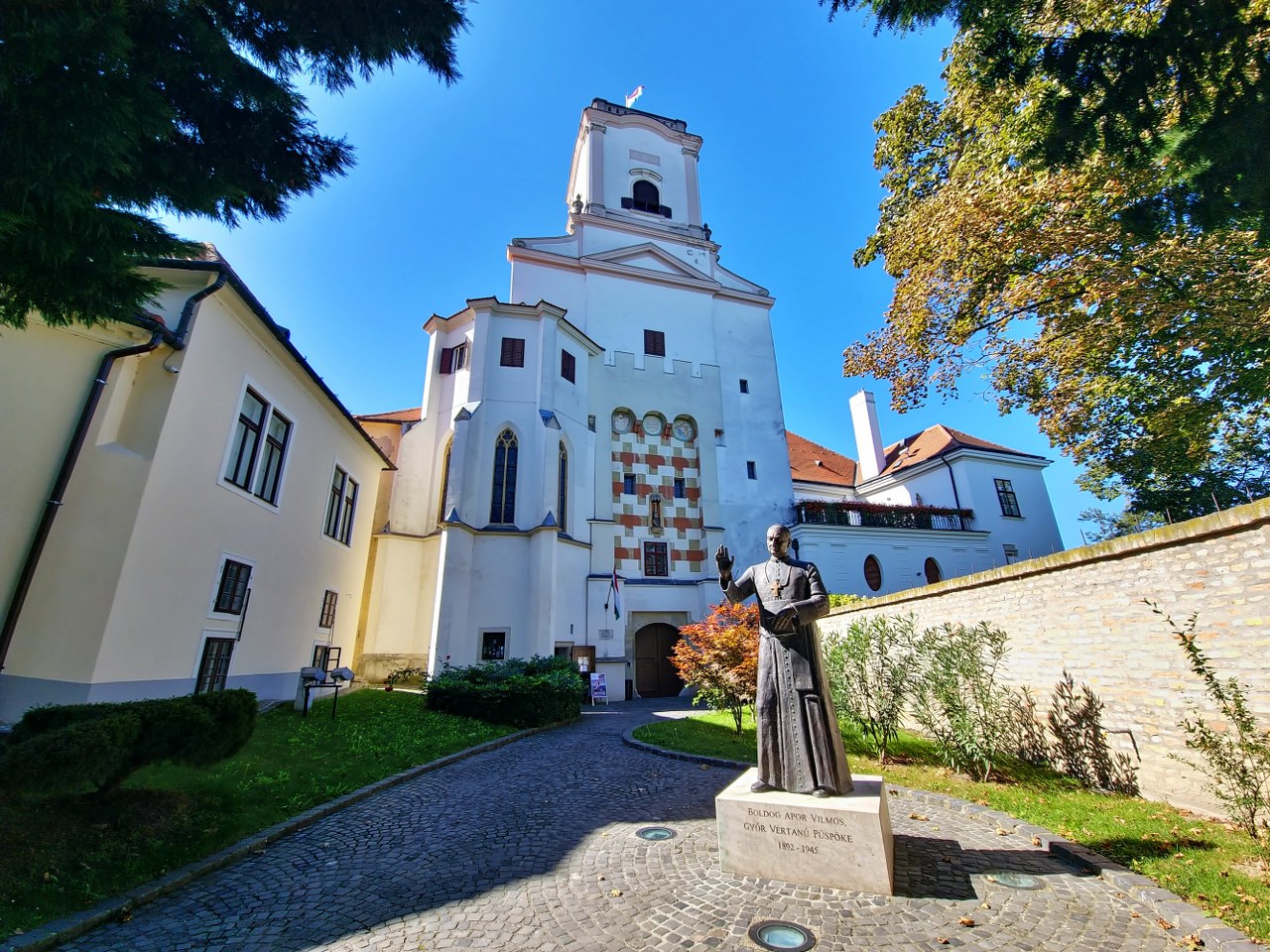 Choć najbardziej rozpoznawalnym fragmentem pałacu pozostaje dziś barokowa wieża to śladów po gotyku kilka się ostało. W surowych wnętrzach, na każdym z pięter znajdziecie niewielką wystawę, czy to opowiadająca o historii pałacu, czy to będącą mikro wystawą sztuki. Najważniejsza ekspozycja czeka w podziemiach, opowiada ona o biskupie Aporze Vilmosie, który w trudnych czasach II Wojny Światowej pomagał prześladowanym Żydom czy Romom. Za niesienie pomocy zapłacił najwyższą cenę ginąc w obronie kobiet szukających schronienia przez radziecką ofensywą w kwietniu 1945.