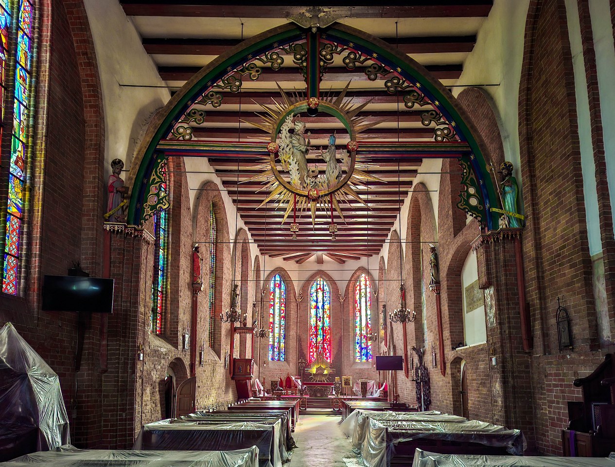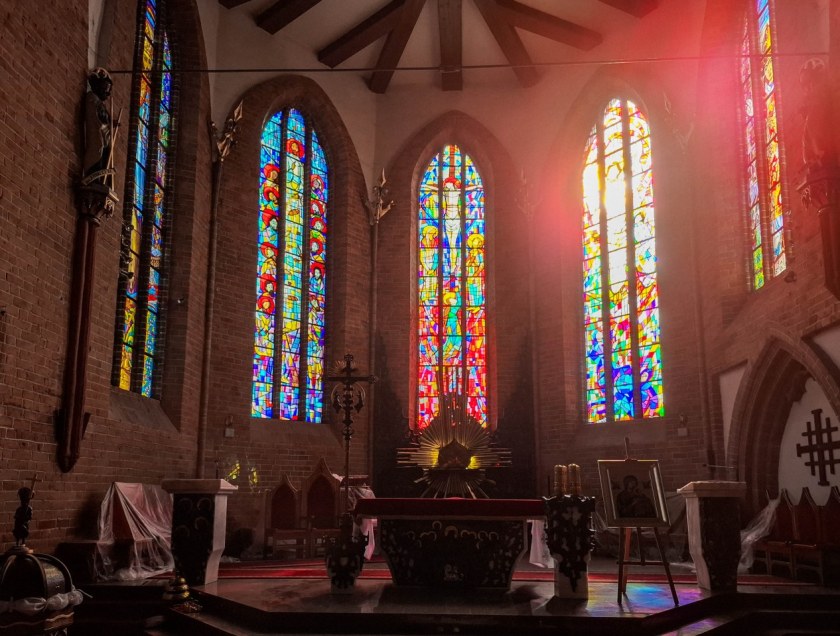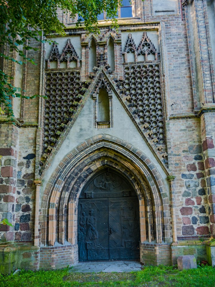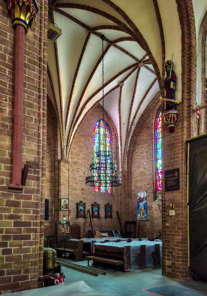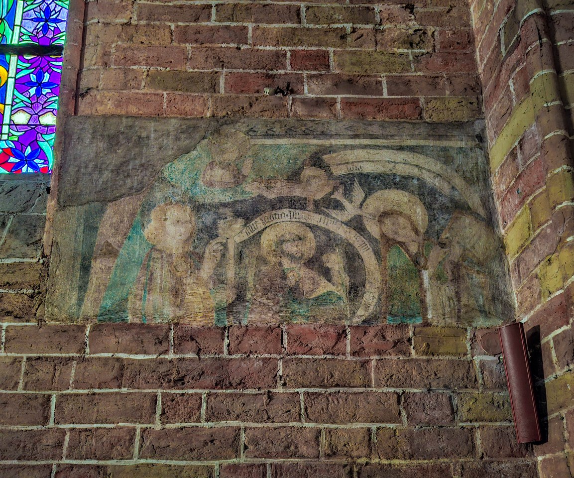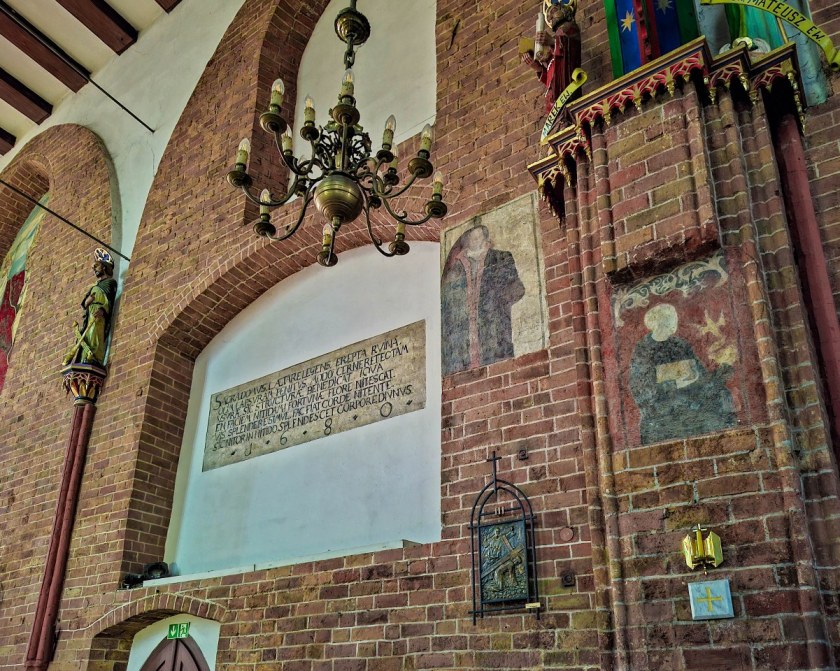 Renowacja kościoła trwa zresztą do dziś, aktualnie trwa kolejny jej etap. Szczęściem jednak wnętrza świątyni są dostępne i zdecydowanie zalecam zajrzenie. Ocalała boczna kaplica z oryginalnym sklepieniem czy szereg dawnych polichromii (w tym jedno przedstawiające najprawdopodobniej Marcina Lutra) warte są chwili zachodu.