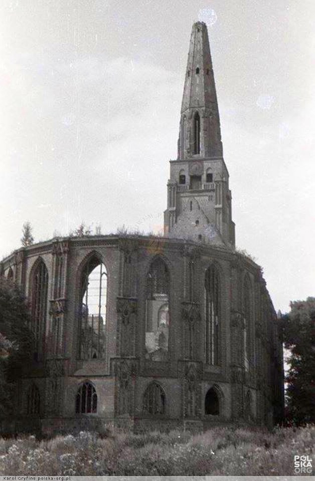 W 1945 roku, podpalony przez radzieckich żołnierzy kościół spłonął. Zawalił się dach, przepadły zabytkowe średniowieczne sklepienia jak i całe wyposażenie wnętrz. Na przełomie lat 80 i 90. rozpoczęła się trwająca tak naprawdę po dziś dzień odbudowa, której jednym z symboli jest wspomniany już przeze mnie nowy dach. Niestety w czasie mojej wizyty brama była zamknięta i nie podpatrzyłem na jakim etapie są prace, ale jeśli tylko będziecie mieć okazję to nie wahajcie się, warto choćby dla jednego fresku Jezusa Ukrzyżowanego przez Cnoty. Kościół nie pełni obecnie swej sakralnej funkcji, albo inaczej nie pełni jej w takim zakresie jak dawniej – zapewne zmieni się to po finalizacji odbudowy. Do tego czasu, raz po raz (najczęściej latem) otwiera on swoje podwoje.