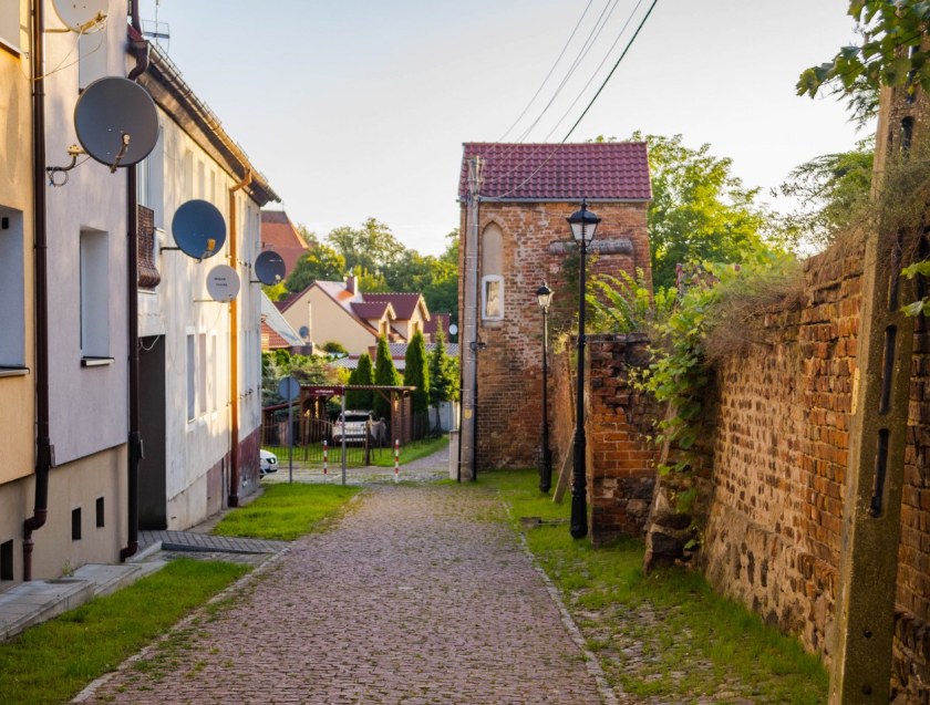 Nasz spacer zakończymy poza Starym Miastem, bo i tu zachowało się wiele historycznych stempli. To poza granicą średniowiecznych fortyfikacji budowano wszystkie ważne dla funkcjonowania miasta gmachy, urząd gminy, pocztę czy szkoły – neogotyckie gimnazjum nauczycielskie wciąż istnieje, lecz modernistyczny gmach przy ulicy Dworcowej wojny nie przetrwał. Pomiędzy ceglanymi budynkami urzędowymi raz po raz zauważyć można starsze wille o ciekawych bryłach czy w końcu najmłodszy z chojeńskich kościołów, Kościół Najświętszego Serca Pana, oczywiście neogotycki i ceglany. Lubię takie przedmieścia.
