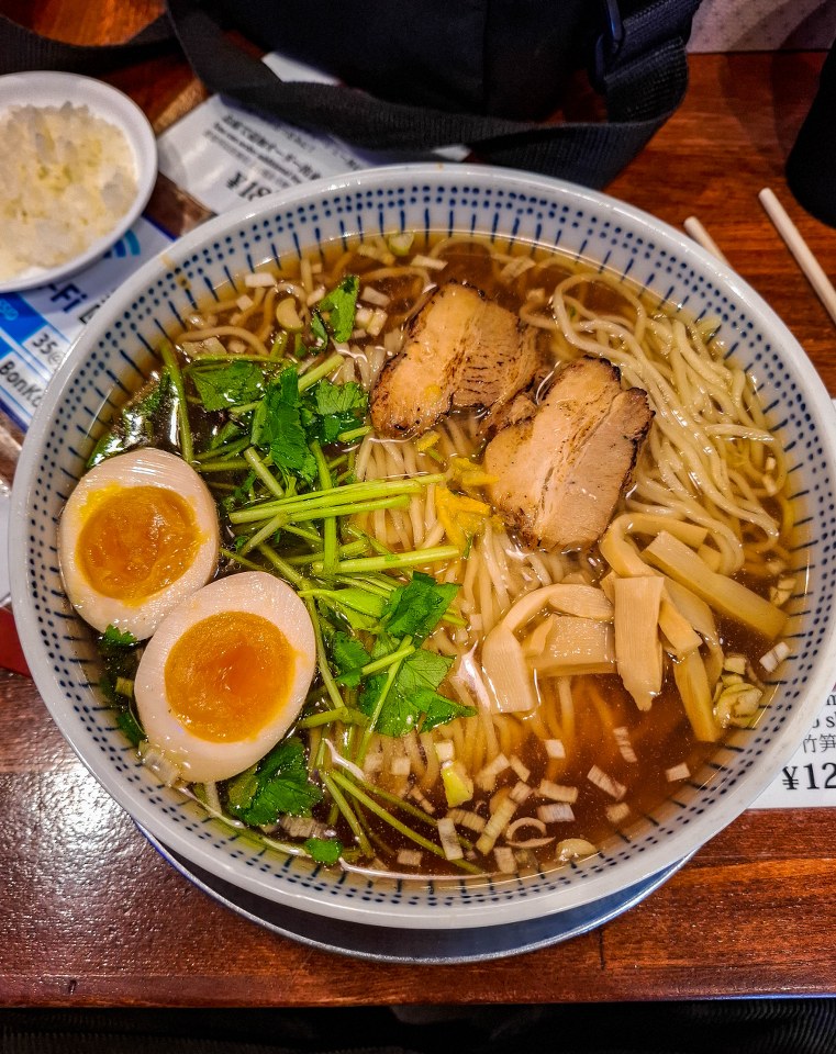 Wróćmy jednak do naszego spaceru. Niewątpliwym plusem Tokio jest fakt, że niezależne kiedy zgłodniejecie to zawsze pod nosem znajdziecie jakąś knajpkę czy restaurację – w całej prefekturze jest ich ponad 160 000! i chyba nie ma ulicy (ok, pewnie są) na której nie byłoby jakiegoś małego lokalu. Na pierwszy ogień zapragnąłem wpałaszować coś znanego, jednak zaglądając do kolejnych, pełnych ramen-ya poczułem pewnego rodzaju onieśmielenie. Wtedy znalazłem tę jedyną, z kilkoma jeszcze wolnymi miejscami. Tokyo Ramen Tower jest lokalem niewielkim, z miejscami tylko przy ladzie, gdzie szef kuchni ze startu wita cię radosnym „Irasshaimase!” i angielskim pytaniem czy dasz sobie radę z obsługą automatu na jakim zamawia się jedzonko. Uśmiech sam ląduje na twarzy. Specjalność szefa, shoyu ramen okazał się porcją przepotężną, i jako pierwsze danie po przylocie stanowił wyzwanie 😀 Czy wyczyściłem miskę do ostatniego listka mitsuby i pędów menmy? No jasne. Za zestaw razem z porcją ryżu zapłaciłem 1450 jenów (34 zł) i był to chyba najdroższy z ramenów na jakie trafiłem!