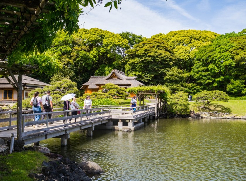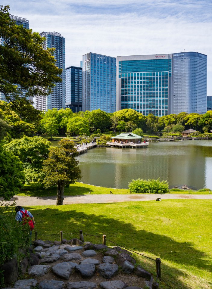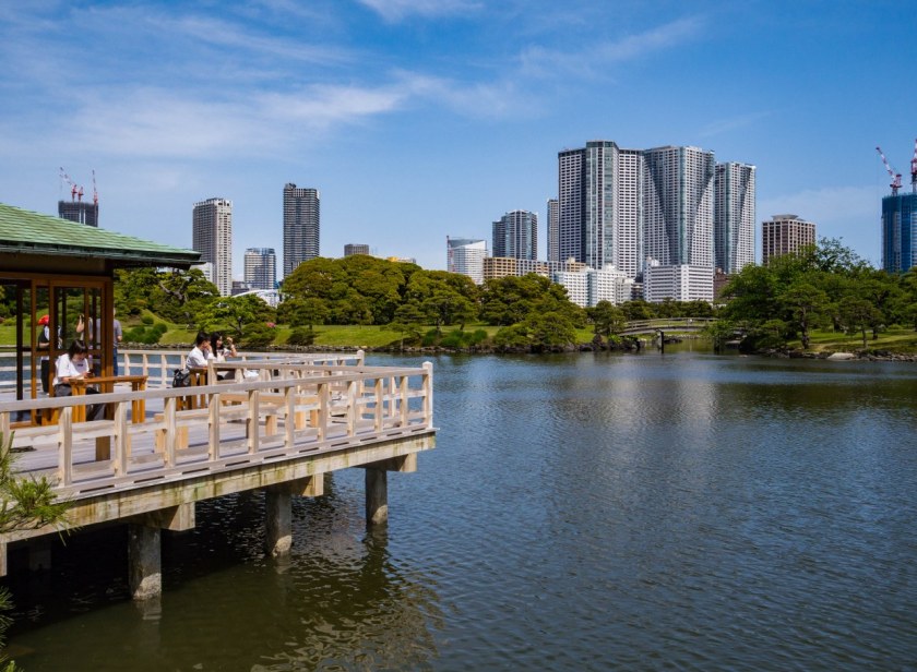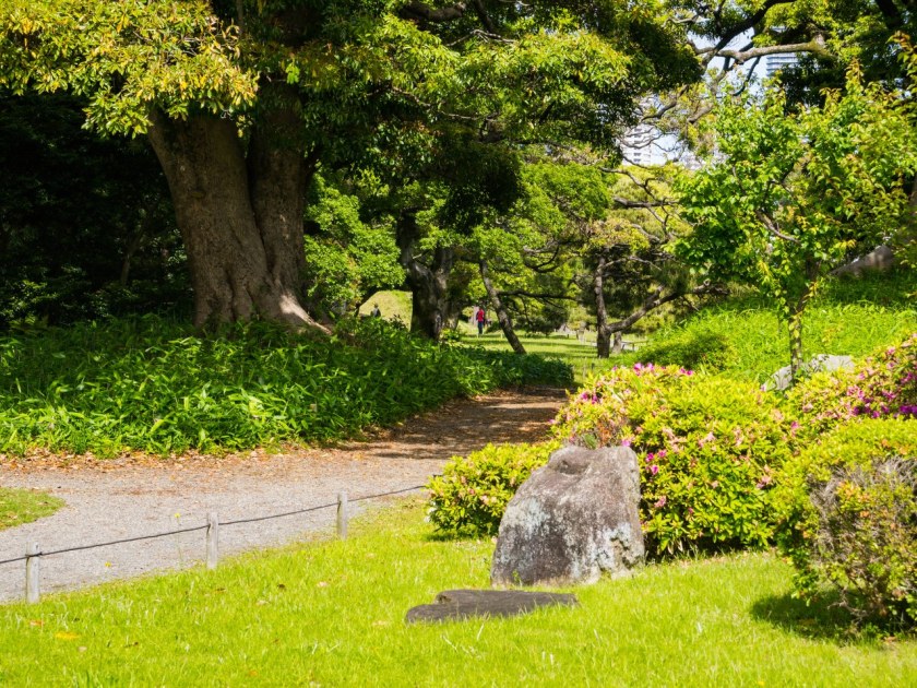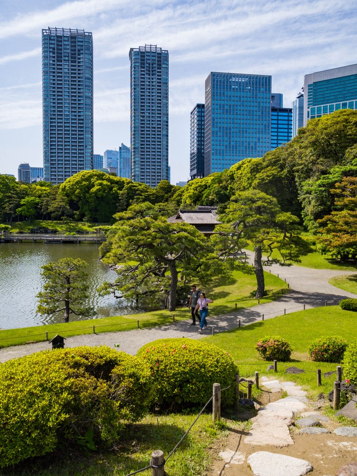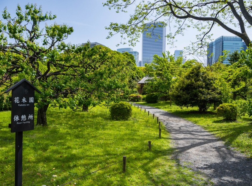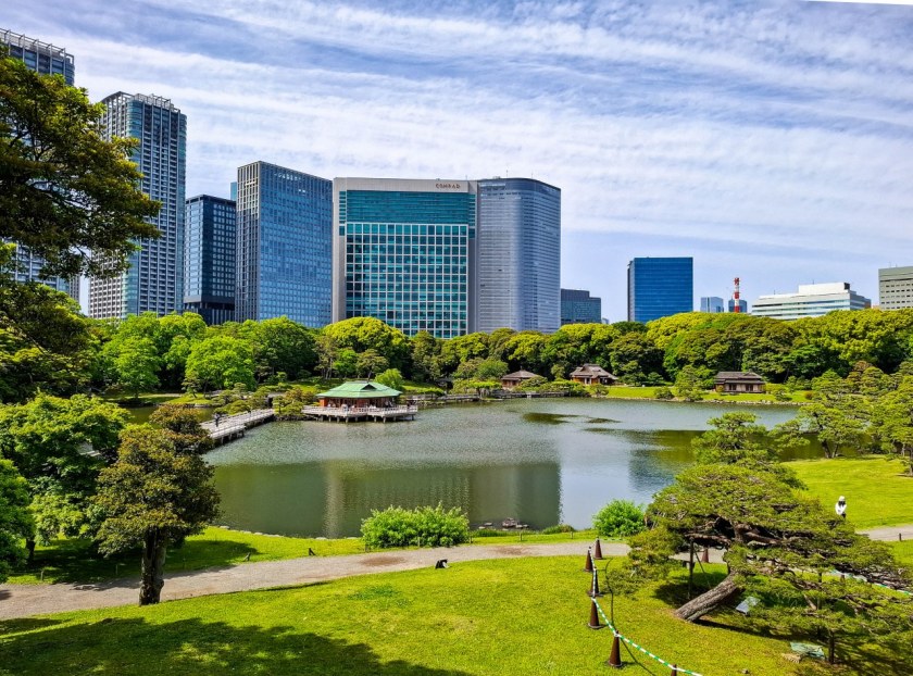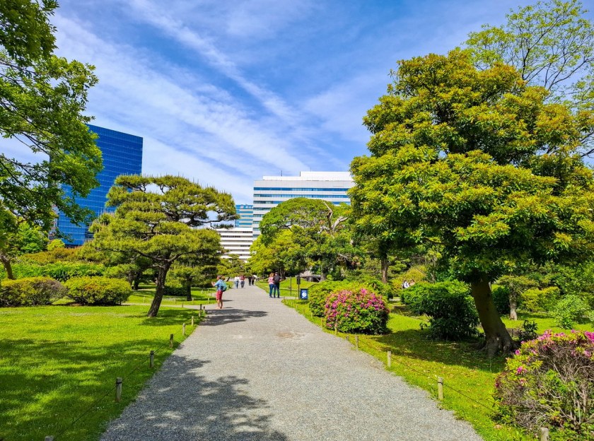 Dzisiejsze Ogrody jak chyba nigdy pozwalają na ucieczkę od zgiełku miasta i nawet z drugim planem w postaci wieżowców dają namiastkę wytchnienia od tego co poza ich granicami. Wiosną i tutaj kwitną śliwy oraz wiśnie a jesienią kiście barwią się na momiji. Kto chce zadowoli się spacerem wzdłuż trzech stawów, nie tylko tego jednego zasilanego wodą morską, ale i dwóch mniejszych, niegdyś służących do polowań na kaczki. Człowiek nawet nie zauważy jak w cieniu co najmniej stuletnich drzew (a mówi się, że nawet i jednej 300 letniej czarnej sosny), pokonując jeden z wielu mostków czy wspinając się na kopiec symbolizujący Fuji-san zrobi ponad 3 kilometry marszu. A jak się zmęczycie to w odbudowanej herbaciarni Nakajima można przysiąść na klasycznej matchy i małym słodkim co nieco.