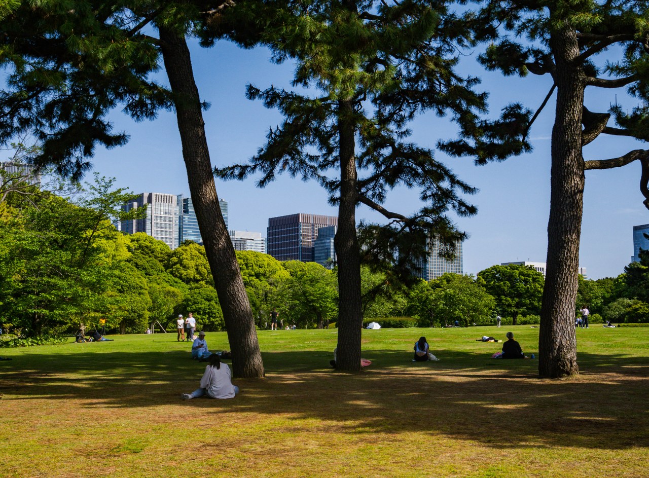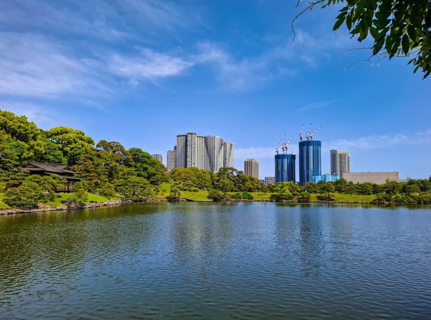 Ogrody Hama-rikyu, jedna z tych zielonych oaz w Tokio, która robi najbardziej szczękoopadające wrażenie, gdzie kontrast pomiędzy piękną choć zaprojektowaną przyrodą a górującymi nad nią wieżowcami jest uderzający. Tak, kiedy tylko zobaczyłem zdjęcia drapaczy chmur z sąsiedniego Shiodome czy odległej Tsukishimy odbijających się w wodach stawu Shioiri (潮入の池) wiedziałem, że będę musiał ujrzeć to cudo na własne oczy. Jakżeż cudownym był fakt, że fotografie nie przekłamują a wręcz nie dotrzymują kroku rzeczywistości. A szum pędzącego miasta staje się jakiś taki niemrawy, wyczuwalny, ale jednak odległy.