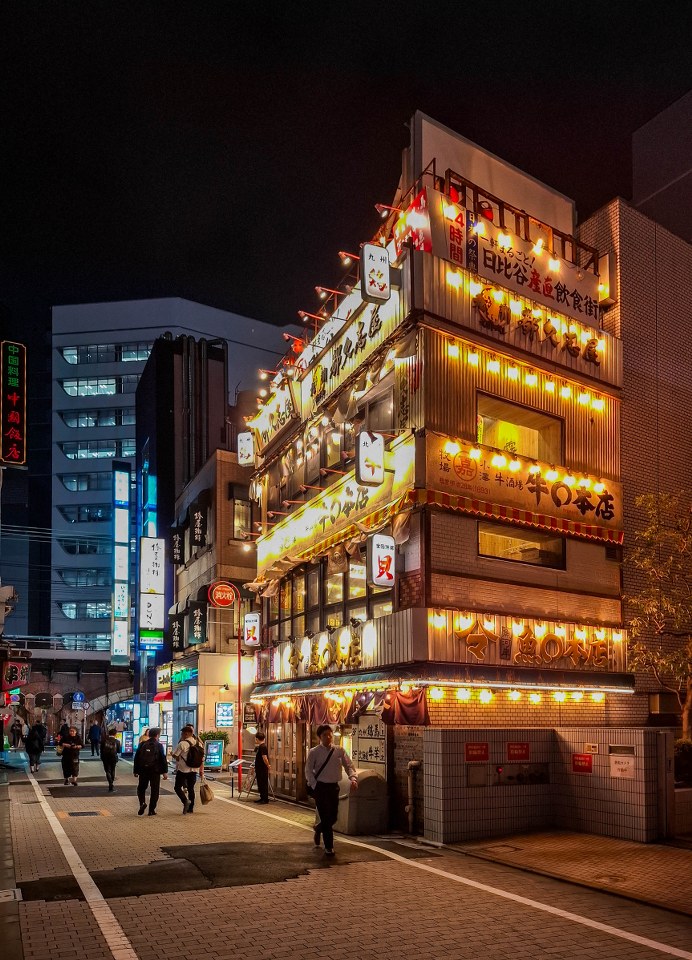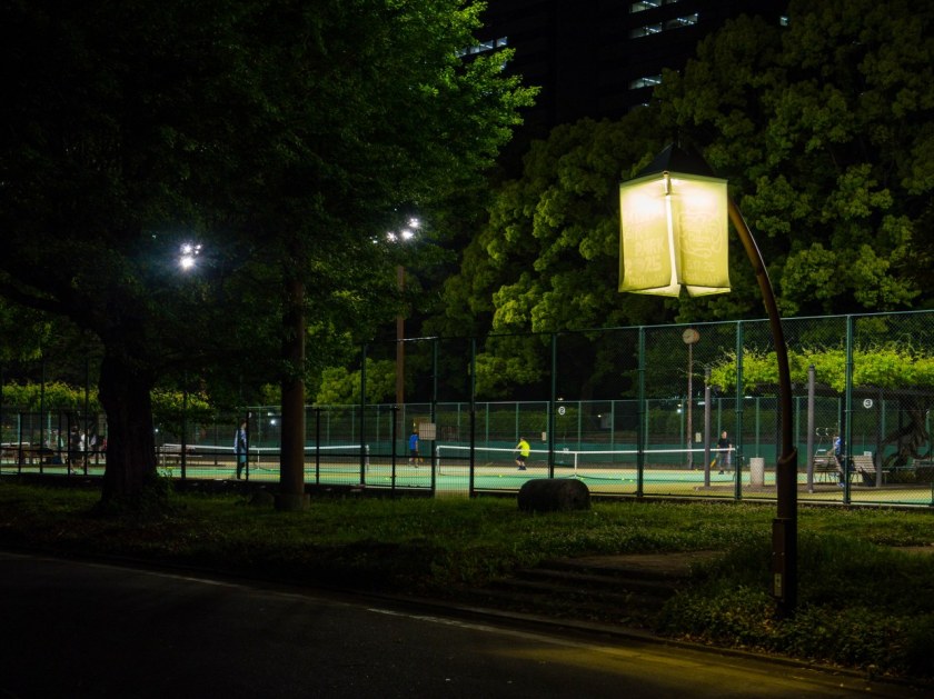 Hibiya w ogóle okazała się przyjemną okolicą na wieczorny spacer. Wolna od tłumów, z klimatycznymi knajpkami po drodze no i przede wszystkim z Parkiem Hibiya, będącym domem dla ponad 500 letniego miłorzębu, dającym przestrzeń do wyszalenia się wielbicielom tenisa tak ziemnego i stołowego. Na jego skraju wznosi się masywny, 100-letni modernistyczny budynek będący symbolem odbudowy Tokio po trzęsieniu ziemi w 1923 roku – Hibiya Public Hall. Wzmocniona żelbetem, o elewacji z czerwonej cegły, przez wielu z rozrzewnieniem wspominana jako najważniejsza sala koncertowa dawnego miasta, dla innych miejsce kojarzące się z uwiecznionym zdjęciem nagrodzonym nagrodą Pulitzera, zabójstwem polityka Inejirō Asanumy. Dla pojedynczych jednostek, tak bardzo „nie wpisujących się w obraz współczesnej Japonii” miejsce gdzie nocami rozkładają namioty, wyczekując następnego dnia – szczerze powiedziawszy dopiero przeglądając zdjęcia zorientowałem się, że pod budynkiem nocują bezdomni, jeszcze bardziej zdziwiłem się kiedy obejrzałem o nich materiał na yt.