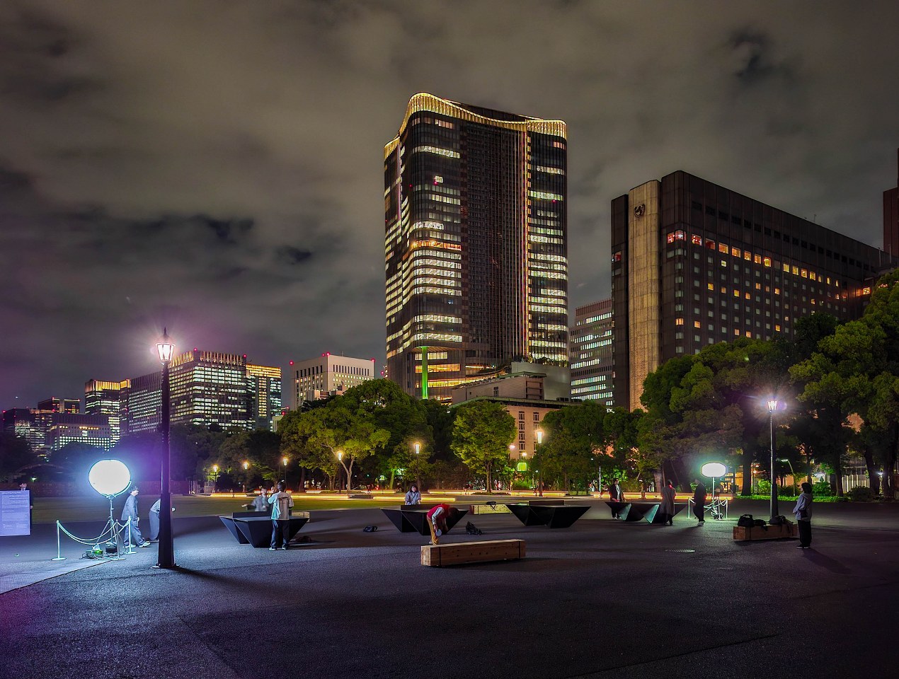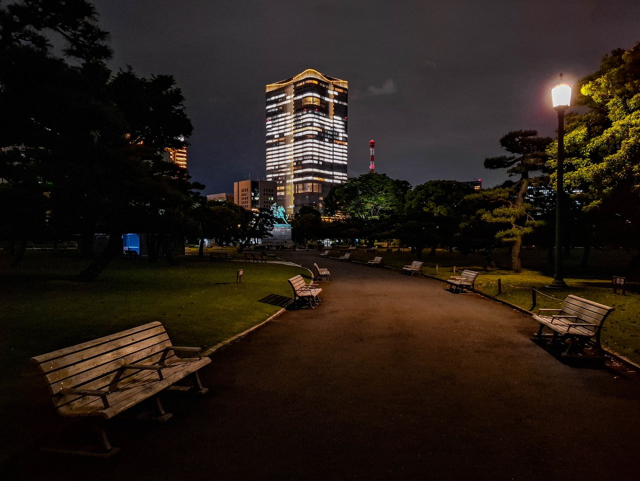 I tak wróciliśmy w okolice Pałacu Cesarskiego, który po zmroku okazuje się są fajnym miejscem do podglądania nocnego acz nie neonowego Tokio. Wschodnie Ogrody są rzecz jasna już zamknięte, ale Narodowy Ogród Kōkyogaien absolutnie daje radę w jego zastępstwie. W centrum Ogrodu trafić można na pomnik Masashige Kusunokiego, bohatera wielu opowieści, samuraja, będącego uosobieniem dozgonnej (ciekawe czy Thanos doceniłby tę grę z słów) wierności cesarzowi.