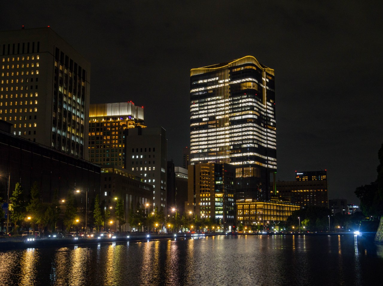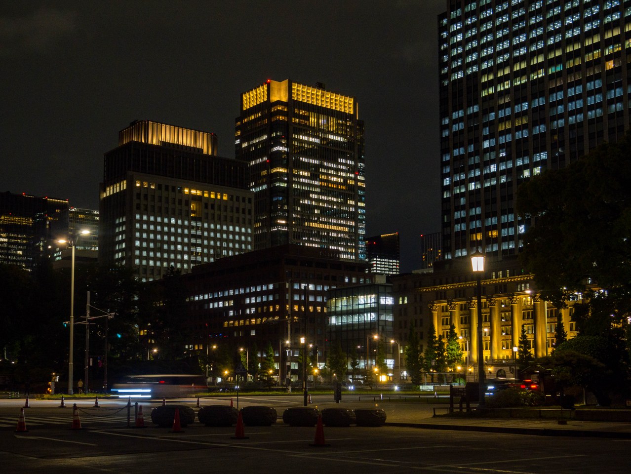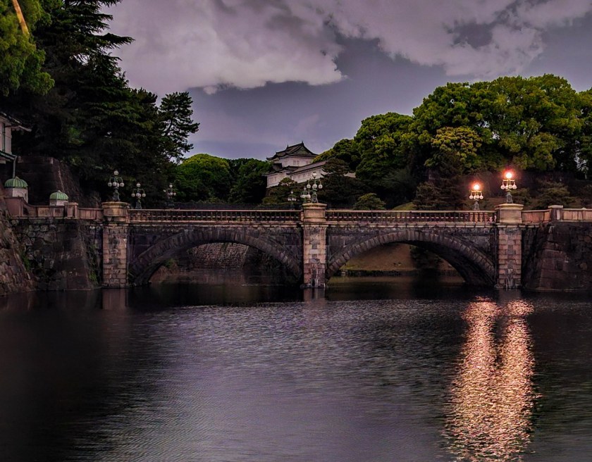 Odbijające się w fosie wieżowce prezentują się ciekawie, ale i tak całą uwagę zgarnia dla siebie widok na Kamienny Most Głównej Bramy Pałacu, może i niewielki gabarytami, ale sławą przykrywający większość pozostałych w Tokio. Wraz z Żelaznym Mostem Głównej Bramy (zwanym też Nijū-bashi, co jest zabawne bo wiele osób nazwę tę rozszerza na oba mosty) będący bohaterem niezliczonej ilość fotografii. Po ciemku nikt nie wchodzi w kadr i tylko pan strażnik siedzący w malutkiej budce lustruje okolicę bystrym wzrokiem. Swoją drogą wczesne i dość krótkie zachody słońca (w okolicach godziny 19) były dla mnie jednym z największych zaskoczeń, nie spodziewałem się w maju takiej niespodzianki.