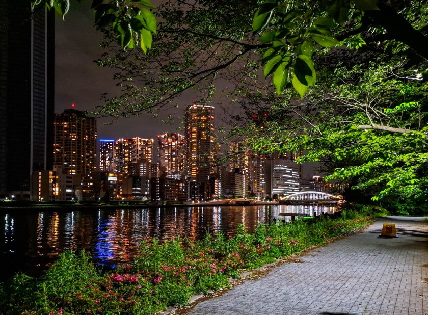 Choć zmęczenie tego dnia nie powiedziało jeszcze ostatniego słowa to i ja postanowiłem nie poddać się bez walki i na ostatni akord udałem się nad rzekę Sumidę, gdzie wcześniej na mapie zaznaczyłem sobie jeden z wielu punktów widokowych na nocne miasto. Odhaczenie na google maps to rzecz prosta, odnalezienie zejścia na niewielką promenadę już takie lekkie nie było. Na szczęście Akashicho Gashi Park znajdujące się niedaleko Zewnętrznego Targu Tsukiji tak jak internety zapewniały oferuje całkiem miłe spojrzenie na spokojną Sumidę i wznoszące się wokół wieżowce a ławeczki idealnie nadają się by skosztować nań jedno z miejscowych zerówek – a znalezienie piw bezalkoholowych w konbini wcale nie jest takie łatwe. Ba, są tam i takie oszukistyczne twory jak Strong Zero, które będąc połączeniem wódki z wodą gazowaną zero mają tylko w nazwie.