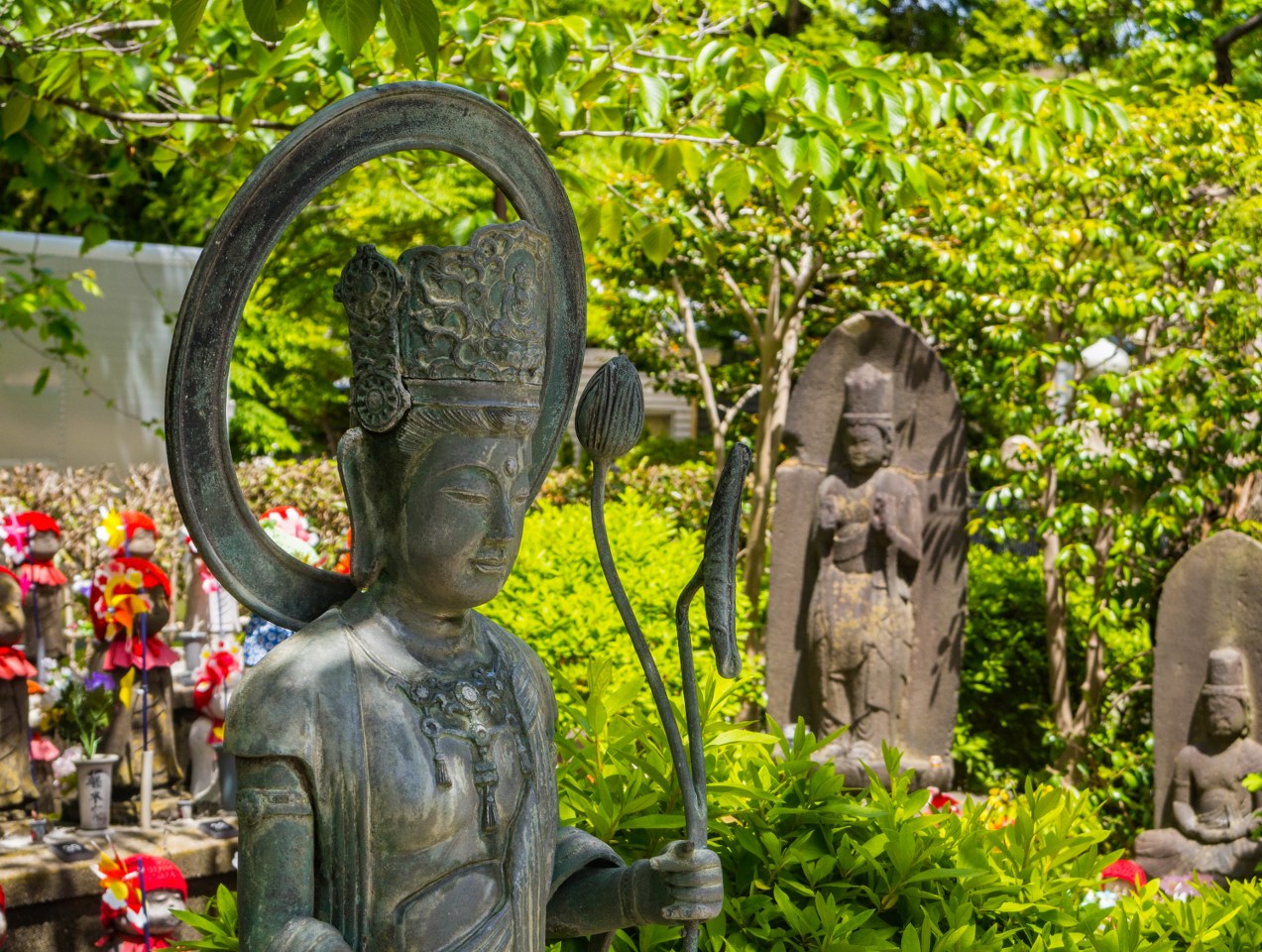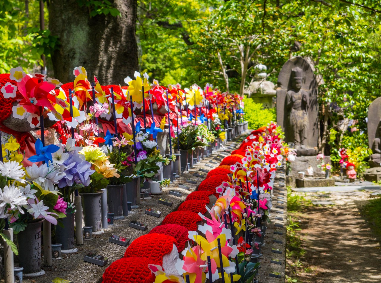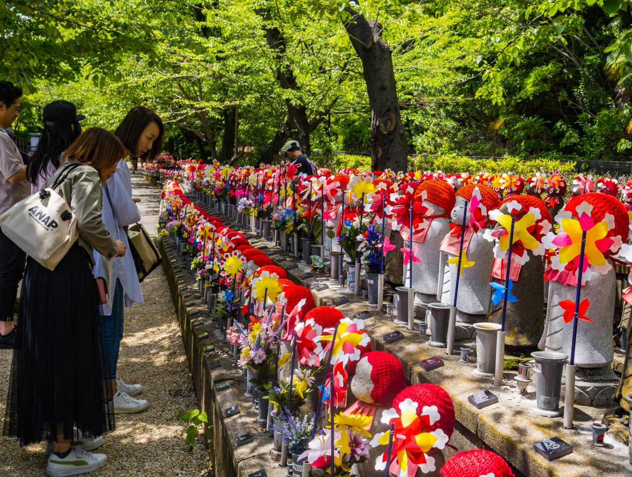 Tuż obok pawilonu Ankoku-den skrywającego w swych wnętrzach Czarnego Buddę, znajdziecie miejsce z jednej strony pełne smutku, a z drugiej dające… hm ukojenie? Ogród Nienarodzonych Dzieci gdzie setki przyodzianych w czerwone czapeczki i śliniaczki posążków uśmiechniętego Jizō Bosatsu, (opiekuna m.in. noworodków) pomagają rodzicom w przepracowaniu bólu po stracie dziecka a co bardziej wierzącym dają nadzieję na to, że droga do reinkarnacji jest dla ich dzieci wciąż otwarta. Niezwykła to alejka.