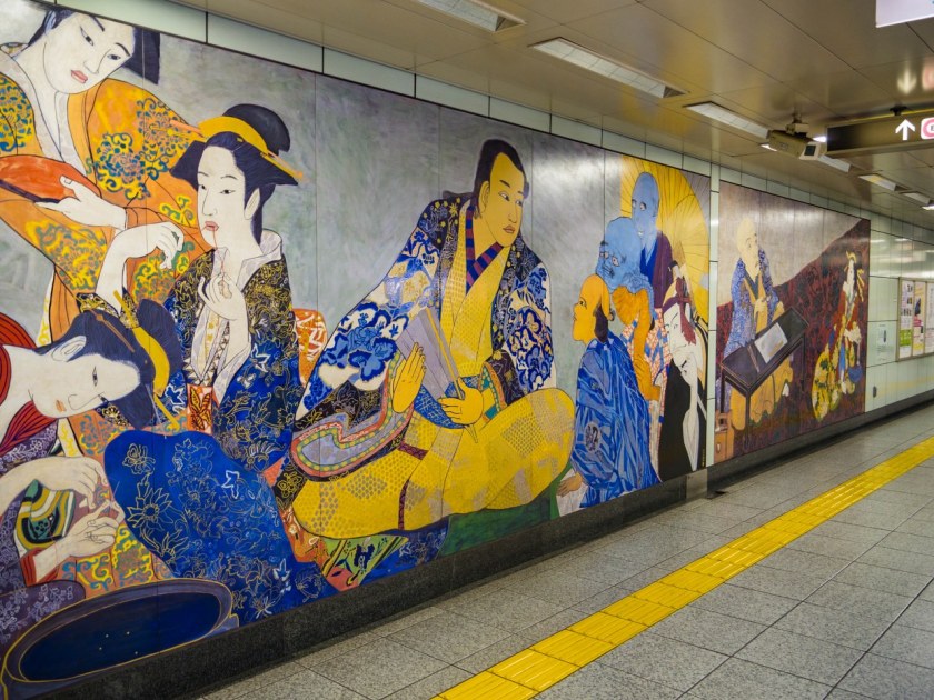 Korzystając z zielonego nastroju uznałem, że warto upiec dwie pieczenie na jednym ogniu, dlatego dzielnicę Chūō zamieniłem na sąsiednią Chiyodę i szybciusio podjechałem w okolice Pałacu Cesarskiego, gdzie można pobuszować po przypałacowych parkach i ogrodach. Żal nie skorzystać. Polecam zahaczyć o przystanek metra Tsukijishijo, gdzie traficie na „mural” a raczej ceramiczny duplikat obrazu Tamako Kataoki, jednej z najwybitniejszych japońskich malarek XX-wieku.