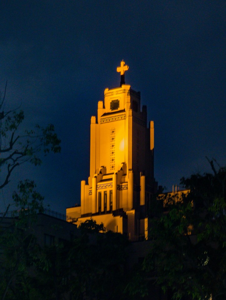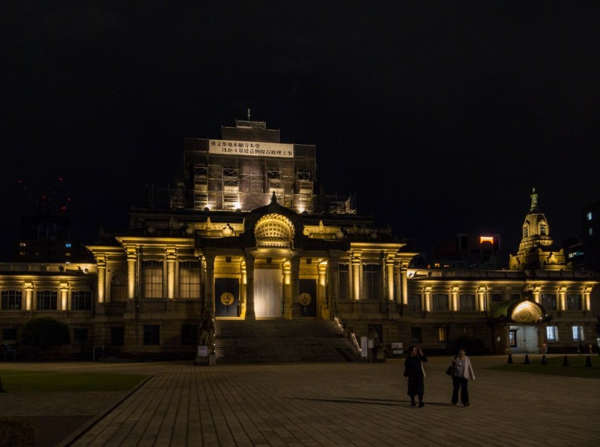 Okolice wspomnianego Zewnętrznego Targu Rybnego Tsukiji (będącego przecież li „tylko” gastronomicznym powidokiem po faktycznym, największym na świecie Targu Rybnym, przeniesionym do pobliskiego Toyosu) bywają w ciągu dnia niesamowicie zatłoczone, wieczorem za to świeciły pustkami. Trochę mi dziś żal, że nie zajrzałem tam wcześniej, ale jest to pomysł na przyszłoroczny powrót. Puste ulice, pusty targ, pusty był i plac przed świątynią Tsukuji Hongwanji, przyznam, że jednej z najciekawszych świątyń jakie w Tokio spotkałem. Buddyjska acz architektonicznie mało japońska, mocno inspirująca się Indiami, półwyspem Indochińskim czy nawet i Europą. No trzeba przyznać, że Itō Chūta, persona ważna dla XX-wiecznej architektury japońskiej, podejmując się projektu odbudowy zniszczonej w wielkim trzęsieniu ziemi świątyni niesamowicie ciekawą wybrał koncepcję. Warto rzucić nań choć okiem.