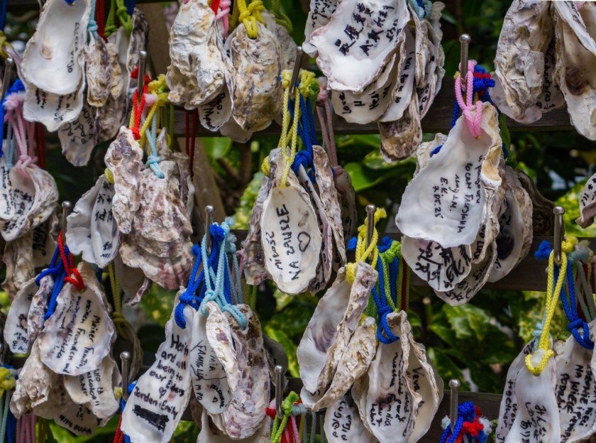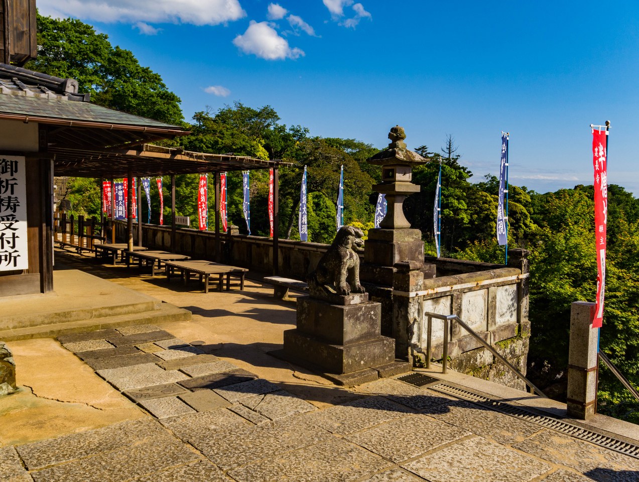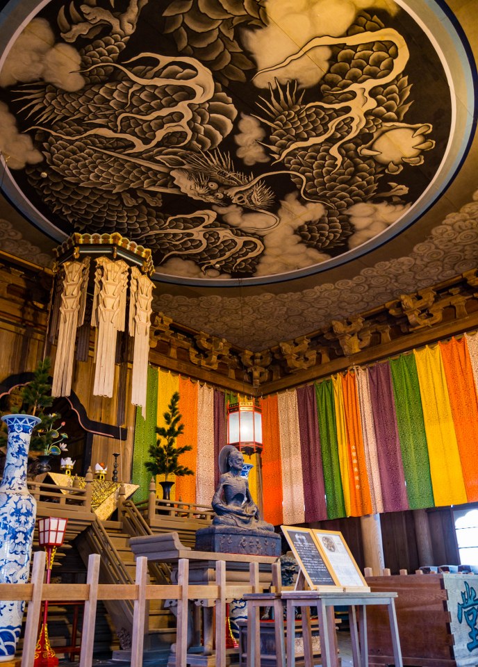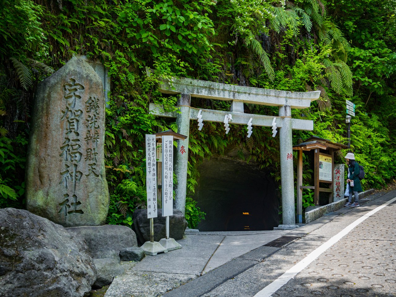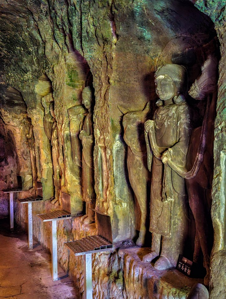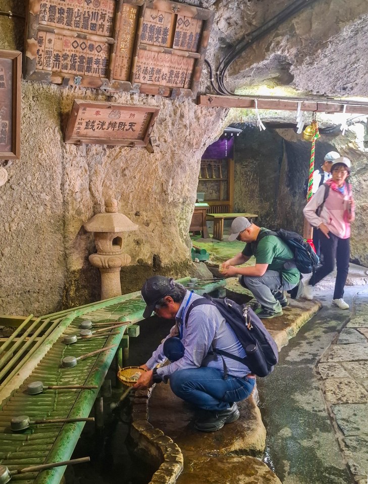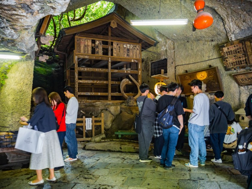 Niewielka jaskinia skrywa rzeźbione w skale wizerunki bogini Benten i jej 16 dzieci a kolejna legenda głosi, że to właśnie w chłodnych wnętrzach groty przed setkami lat skupienia szukał Kobo-Daishi, postać niezwykle ważna nie tylko dla buddyzmu, ale i japońskiej kaligrafii. Jest i miejsce dla shintoistycznej kapliczki Inari (kami płodności i ryżu) przy, której znaleźć można niezwykle oryginalne ema – tabliczki, na których wypisuje się prośby i podziękowania do bóstwa, zazwyczaj drewniane tu występujące pod postacią muszli ostryg.