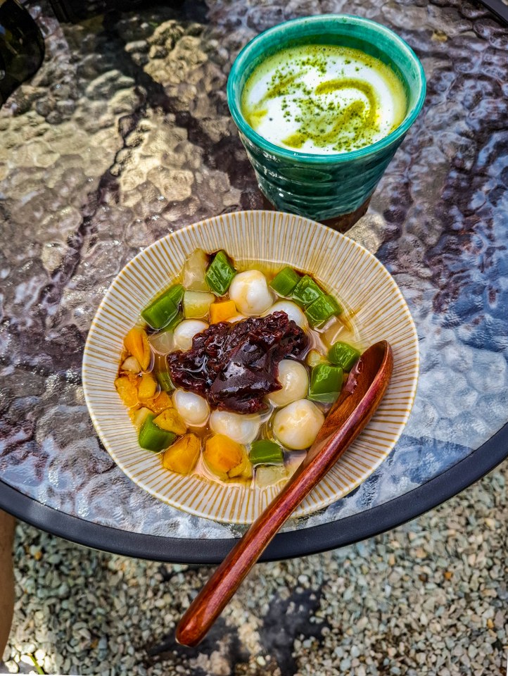 Przyznam wam, że tonące w zieleni, wąskie uliczki o wysokich kamiennych murkach idealnie nadawały się na dalszy spacer. Mały ruch, urokliwa sceneria, atmosfera spokojna jakby żywcem przeniesiona z „Kameliowego Sklepu Papierniczego” Ito Ogawy, feelgoodowej powieści, której akcja leniwie toczy się w Kamakurze właśnie. W tych okolicznościach żołądek dał znać, że pora zrobić mały przystanek. Na szczęście kawiarenek i knajpek jest w mieście pod dostatkiem i tak naprawdę było w czym wybierać. Ładnie grzejące słonko było idealnym towarzyszem dla shiratama anbitsu, klasycznego japońskiego deseru opartego o galaretkę agarową, pastę z fasoli azuki, owoce oraz ryżowe kluseczki polane syropem z brązowego cukru. Ciekawa rzecz.