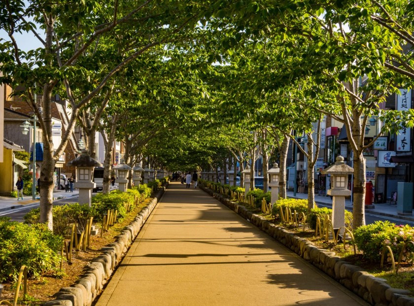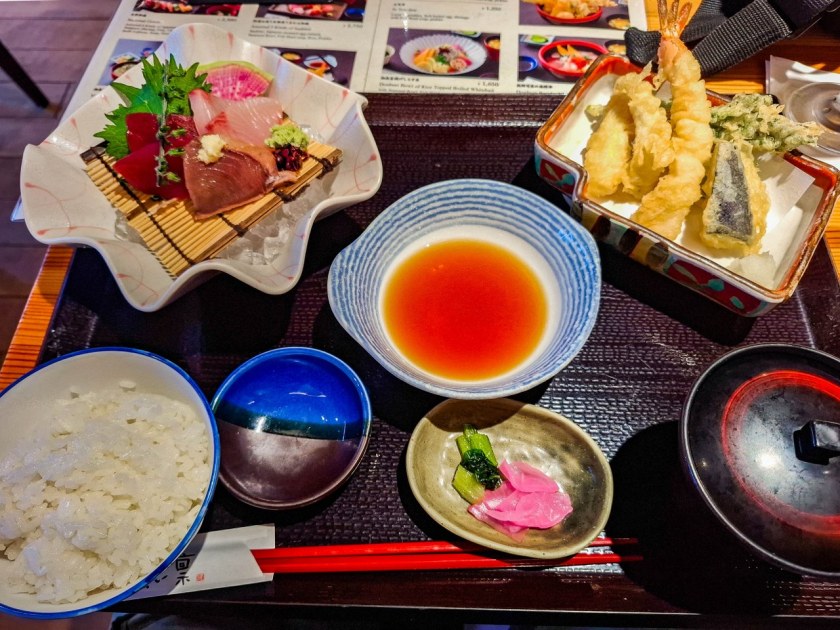 Nie spędzam tam jednak wiele czasu bo… żołądek upomina się o swoje i trzeba ruszyć na poszukiwanie obiadu 😛 Na szczęście chram stanowi jedno z serc Kamakury i prowadzi do niego jedna z najważniejszych ulic w mieście, Wakamiya Ōji, niegdyś spokojna i służąca głównie pielgrzymom udającym się do chramu, dziś pełna knajpek i sklepów, z poprowadzoną pośrodku alejką niewielkich wiśni, pięknie prezentujących się na wiosnę. Równolegle do niej biegnie ulica Komachi, chyba jeszczee bardziej znana miłośnikom jedzenia, pełna street foodu. Obie, w odpowiednich potrafią być jednak tak zatłoczone, że głowa mała. I tak jakoś spacerując nimi zawędrowałem na sam ich koniec pod dworzec kolejowy… gdzie znalazłem bardzo przyjemny lokal, głownie z sushi i tempurą, ale i makaronem soba czy sukiyaki. Zestaw sashimi, krewetek i ryby w tempurze (plus klasyka w postaci ryżu, zupy miso i zestaw pikli) poszedł za bezcen a smak naprawdę mmm.