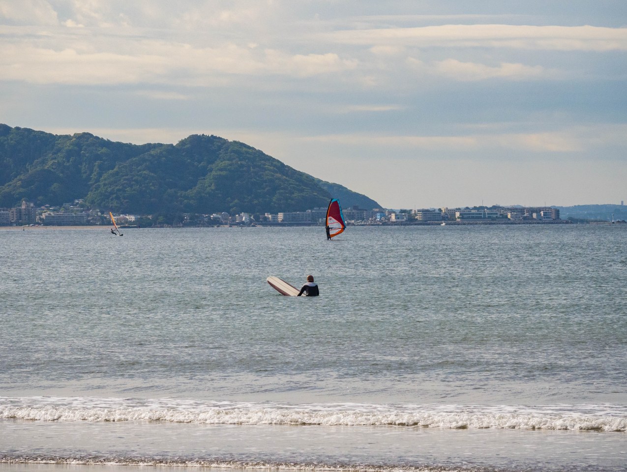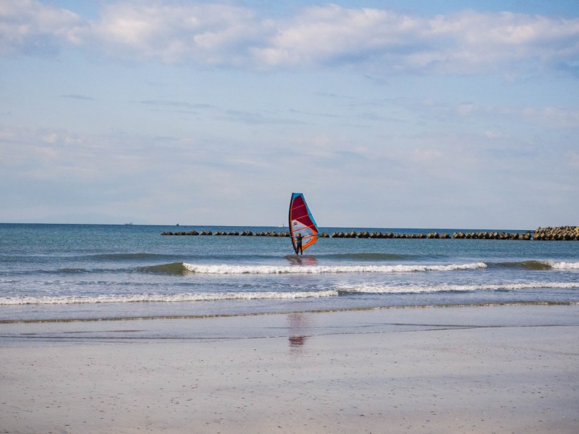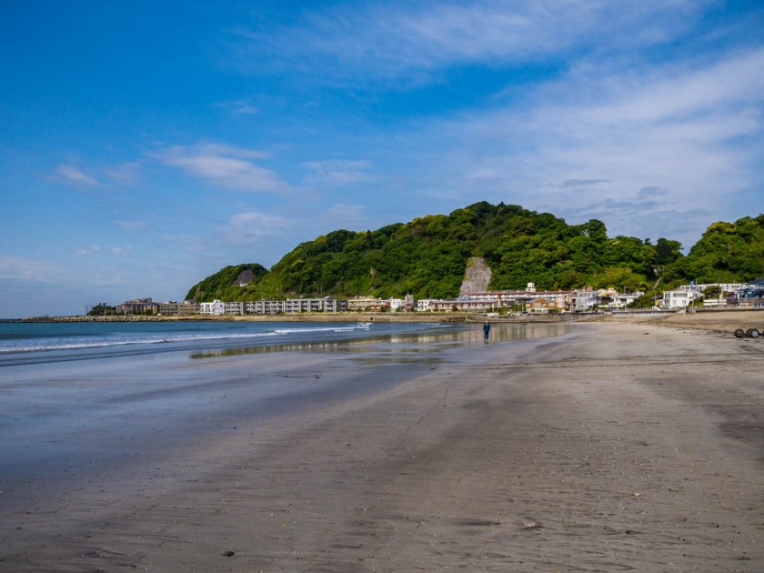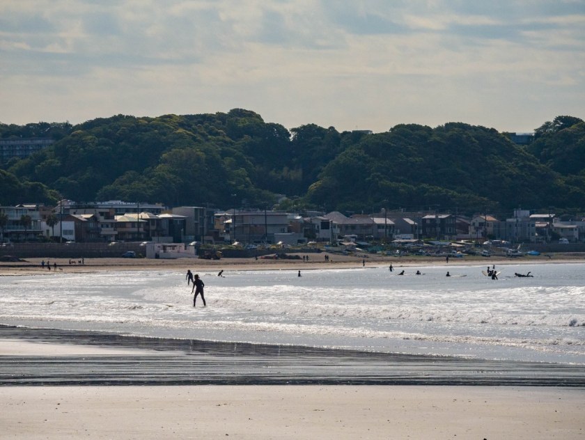Plaże Kamakury przez jednych określane są rajem dla surferów, inni nazywają je idealnymi dla początkujących – ja się nie znam, może jedni i drudzy mają rację, bo czemu by nie. Pewne jest za to, że pusta plaża (z szarym piaskiem o wulkanicznej proweniencji) w sezonie zmienia się nie do poznania, stając się azylem dla wszystkich uciekających z Tokio, szukających tu wytchnienia od letnich upałów. Tymczasem mamy 8 maja, spokojne fale rozbijają się o brzeg, zaczyna się piękny dzień.
