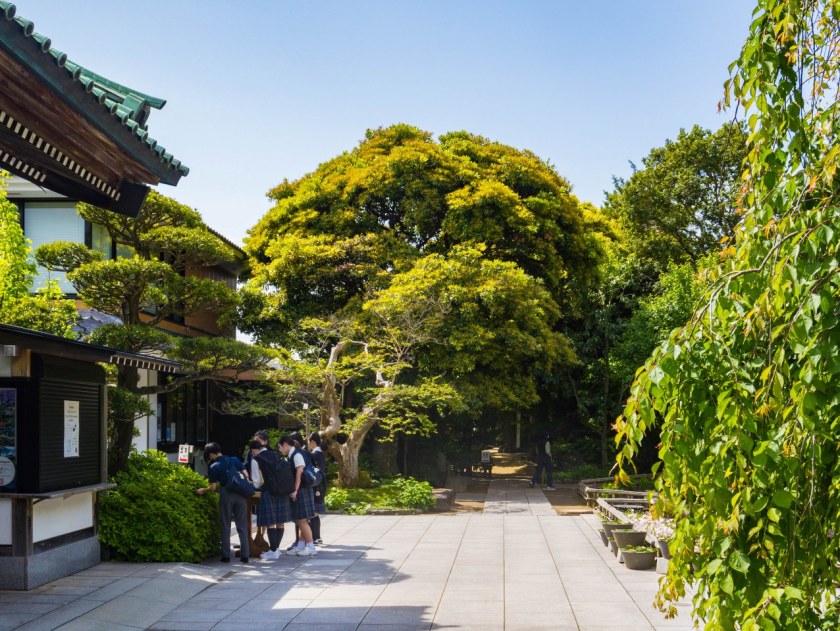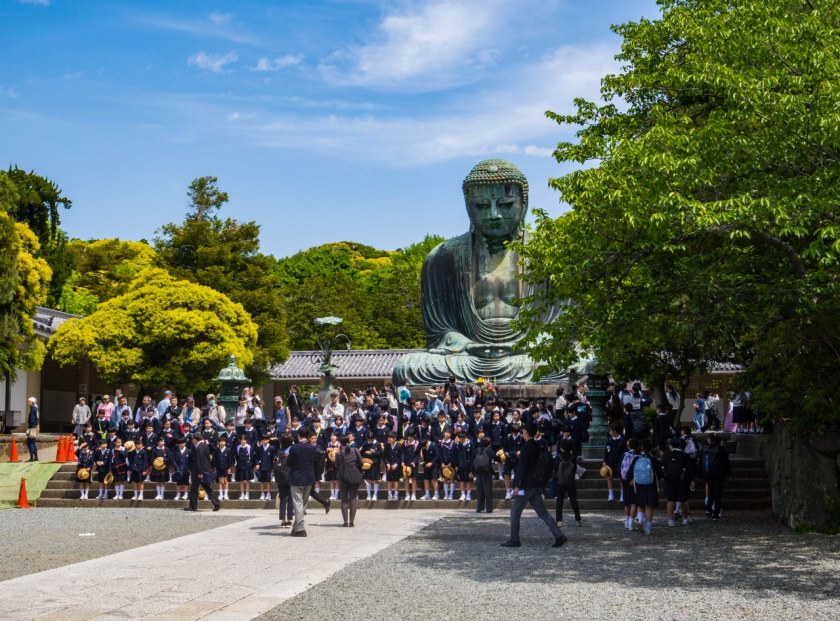 Towarzysząca posągowi świątynia jest zdecydowanie skromniejsza niźli Hasedera, dlatego czekając na wypełnienie goshuincho (za względu na spory ruch otrzymuje się numerek a notes odbiera po chwili czekania) odpoczywam w niewielkim ogrodzie. Zbliża się godzina 10 i jedno z najbardziej znanych miejsc w mieście przeżywa pierwszą falę odwiedzających je tłumów. Nie wiem jednak czy był to widok miarodajny bo też większość przybyłych stanowiły wycieczki szkolne – klasa za klasą, dzieciaki w mundurkach robiły sobie zdjęcia, kontrując niewzruszonego Buddę młodzieńczą energią.