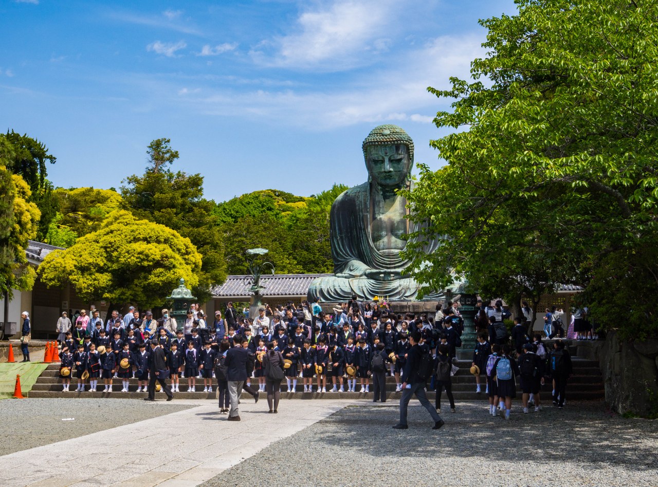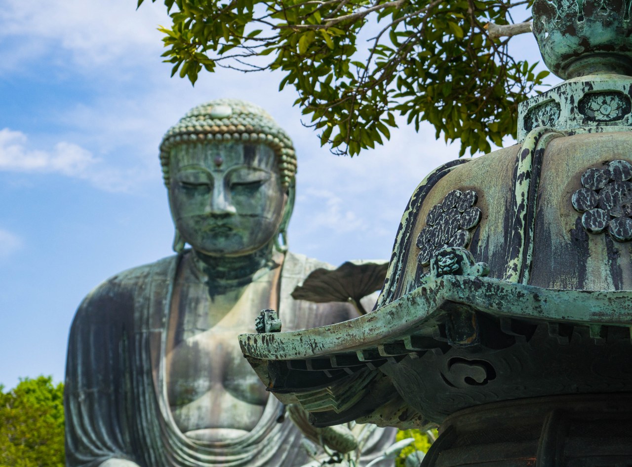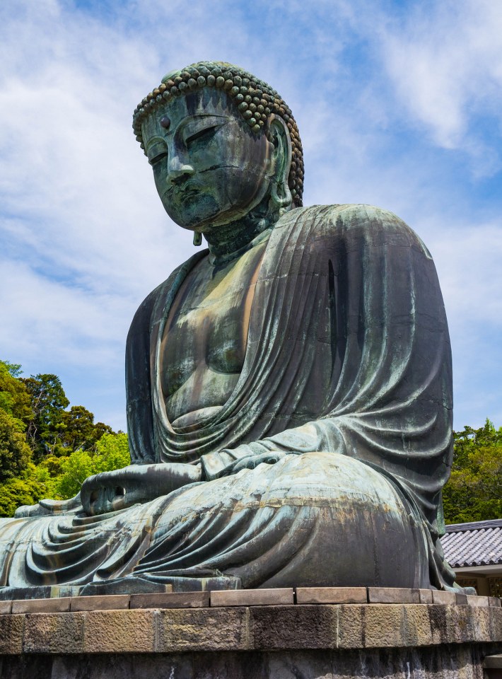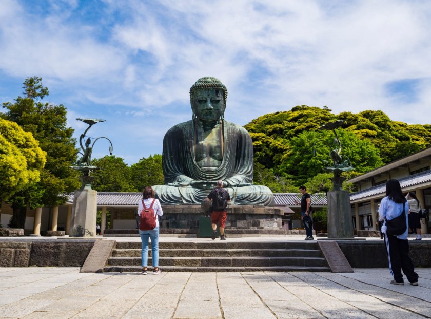 Wielki Budda powstał w 1252 roku i jest szczególny nie tylko ze względu na swe gabaryty. Pierwotnie wybudowano wokół niego wielki pawilon, nie przerwał on jednak wielu nawiedzających Kamakurę kataklizmów – pawilon odbudowywano za każdym jednym razem aż do wielkiego tsunami z początku XV-wieku po którym dano sobie spokój, pozwalając Buddzie na niczym nieograniczone kąpiele słoneczne. Co najciekawsze, mimo przeszło 750 lat na karku posąg bardzo, bardzo rzadko poddawano renowacjom przez co dotrwał do naszych czasów w stanie wielce pierwotnym, i wysłużonym – dodaje mu to jednak uroku.