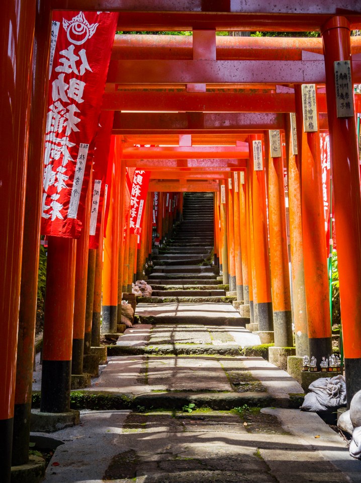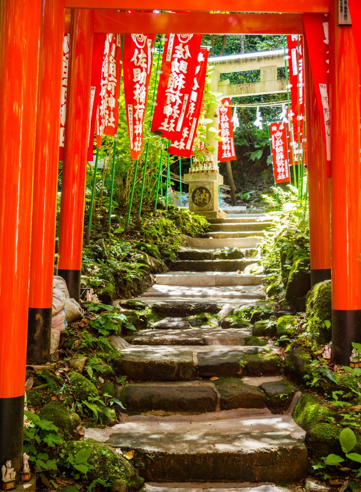 Do chramu prowadzi kilkadziesiąt czerwonych bram torii, i można powiedzieć, każdy ma aleję takich bram na jaką zasłużył – jak się okaże, w Kioto nie dane mi było zobaczyć chramu Fushimi Inari-taisha i tym bardziej cieszę się, że miałem okazję trafić na te w Kamakurze. Podejście po schodach jest tradycyjne skrojone pod trening cardio, idealny po niedawnym deserze.