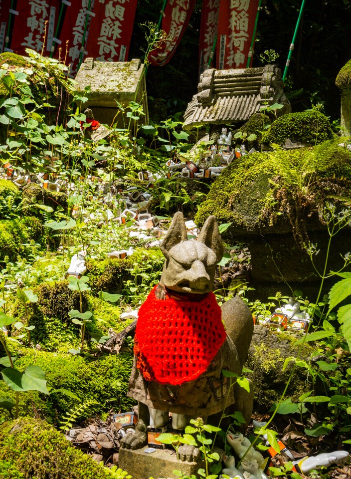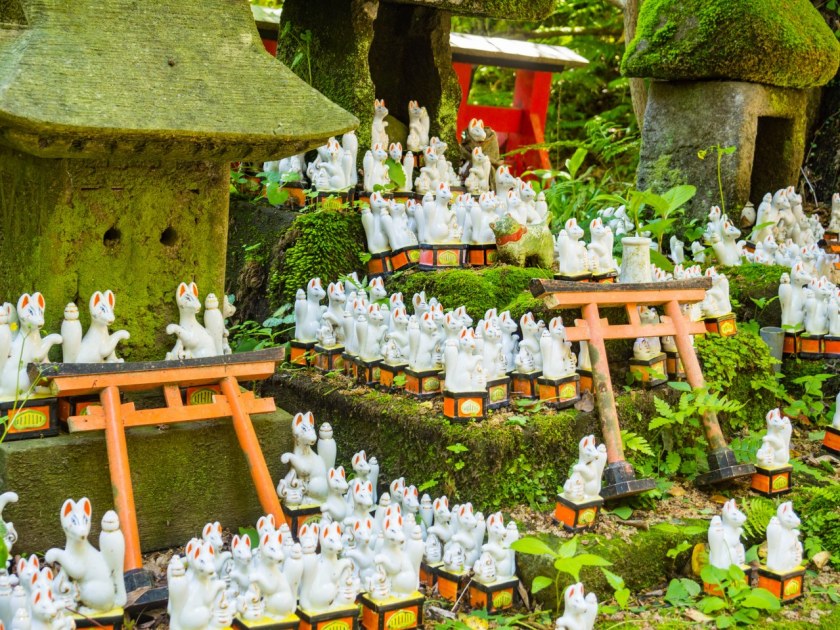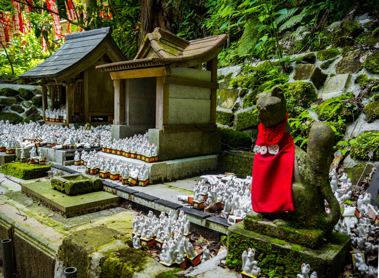 Chram jest niewielki, składa się z kilku skromnych budynków (w tym salki modlitewnej) i malutkich hokora (kapliczek fundowanych przez miejscowych) wokół których ułożonych są tysiące Byakko, białych lisich posłańców Inari, bóstwa płodności, ale i ryżu. Lisy są malutkie porcelanowe, można je kupić na miejscu i pozostawić z własną intencją, są też i większe z kamienia, niekiedy naprawdę wiekowe, przyodziane w dziękczynne śliniaczki. W cieniu pięknego, całkiem pierwotnego lasu, z wszechobecnym mchem wszystko tworzy klimat iście ghiblowski a obecność duchów nie wydaje się być aż tak nieprawdopodobna.
