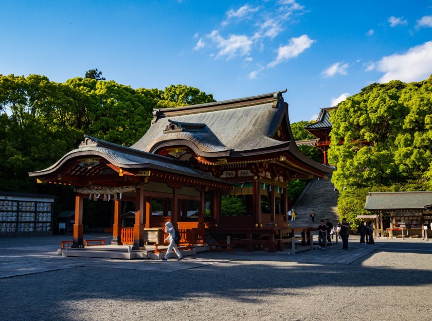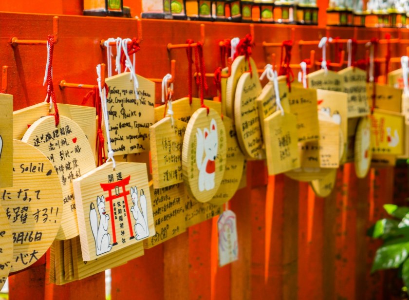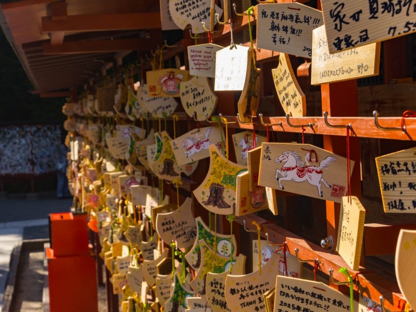 Wokół głównego budynku krzątają się dziesiątki ludzi. Turyści robią zdjęcie na schodach prowadzących do Jogu, głównego chramu, dziadkowie opiekują się wnukami, ostatni wystawcy zamykają kramy z pamiątkami i przekąskami. Stojaki na omikuji uginają się pod nawałem przytroczonych niekorzystnych wróżb, z kolej drewniane ema z symbolem konia kołyszą się lekko na wietrze, niosąc w świat życzenia w każdym możliwym języku.