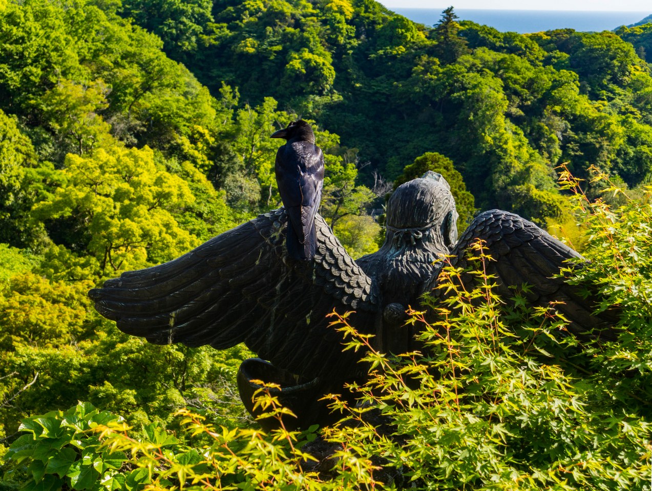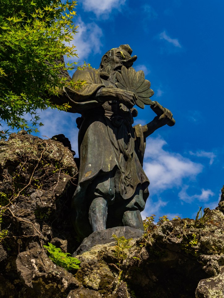 Świątynne tereny oferują mnóstwo mikro zachwytów, kolejne niewielkie kaplice i rzeźby dokładają nowe elementy do wielkiej, jak się okaże nie tylko buddyjskiej układanki, a stojąca na posterunku przyroda dba by spacer obfitował w estetyczne doznania. I to tak fest, w kulminacyjnym podejściu na jedno z okolicznych wzgórz pokonuje się setki schodów, mija mnóstwo małej architektury a nagrodą jest dotarcie do shintoistycznego chramu Hansobo. Bóstwo wraz z dwunastoma tengu od przeszło stu lat pilnuje by pożary omijały Kencho-ji z daleka. Spod chramu tymczasem roztacza się kapitalny widok na okolicę a w odpowiednie dni z platformy widać nawet i Fuji-san. To dobre miejsce by przysiąść na chwilę i chłonąć otaczającą rzeczywistość.