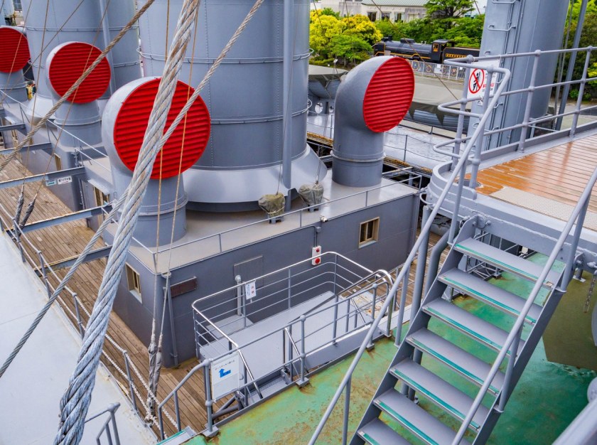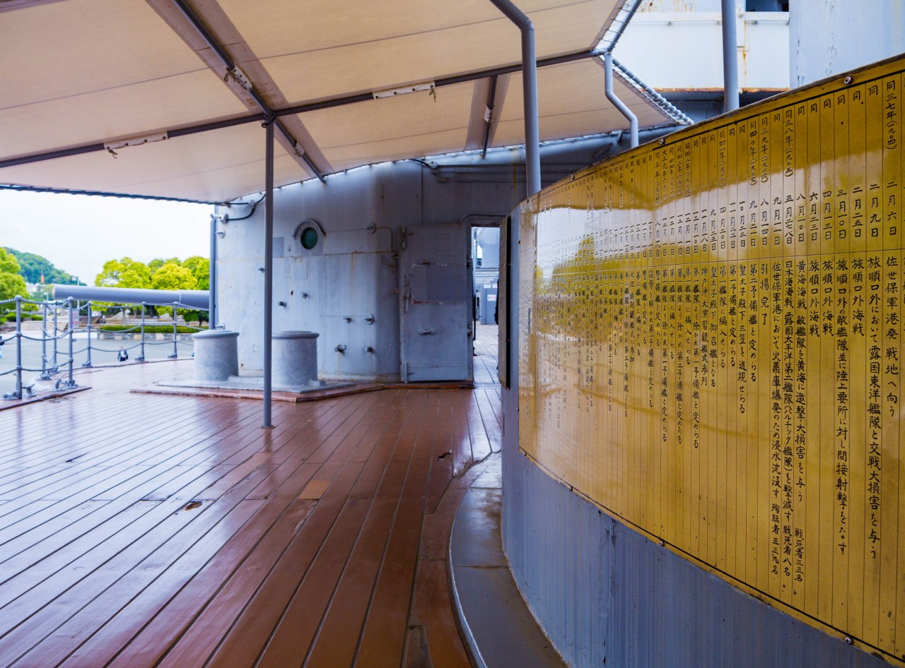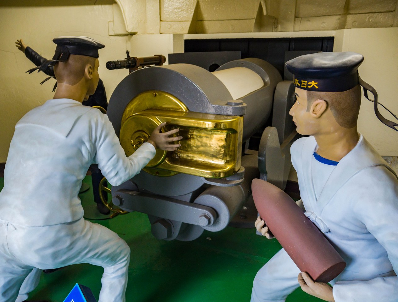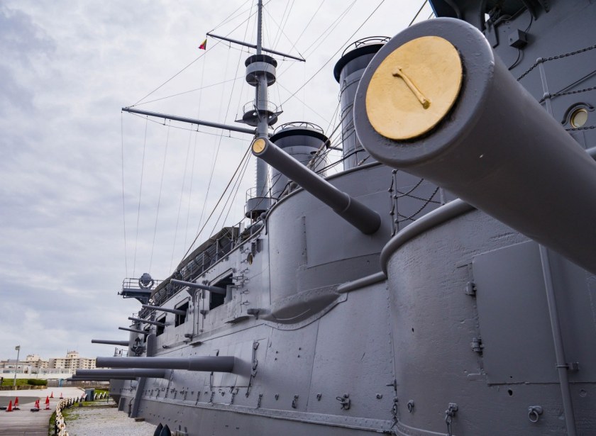 Spacerując po górnym pokładzie najłatwiej zauważyć różnicę pomiędzy oryginalnym i nowszym wyposażeniem. Oba wysokie, charakterystyczne dla predrednotów maszty, kominy czy główna artyleria (305mm) odtworzone są wedle starych planów, sporo części podchodzi tu z chilijskiego pancernika. I wiecie co? Nie ważne, z którego roku dany element pochodzi – liczy się to, że właśnie tak wyglądał oryginalny okręt, i to już 120 lat temu! Robi to piorunujące wrażenie. W wielu miejscach tekowe drewno pokładu jest tym oryginalnym i podczas kluczowej dla wojny z Rosją bitwy przechadzał się po nim admirał Togo. Wszystkie starcia wojny oraz cała historia okrętu przedstawione są na metalowych płytach i są one jedynymi z niewielu gdzie absolutnie przydatna jest znajomość japońskiego.
