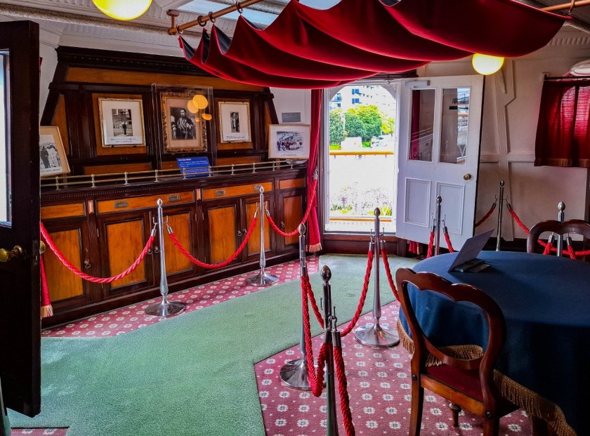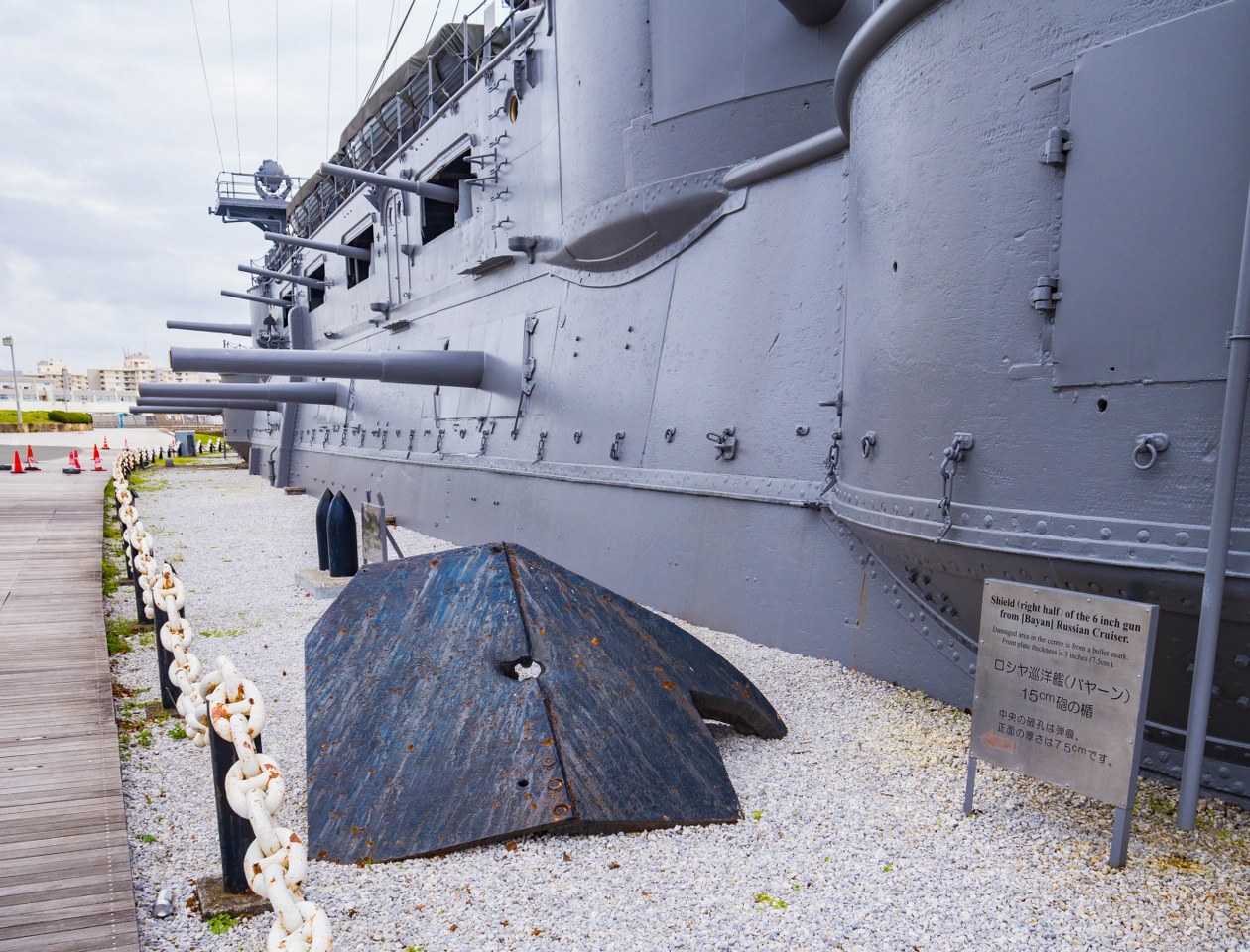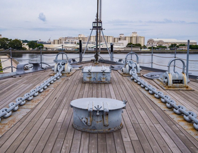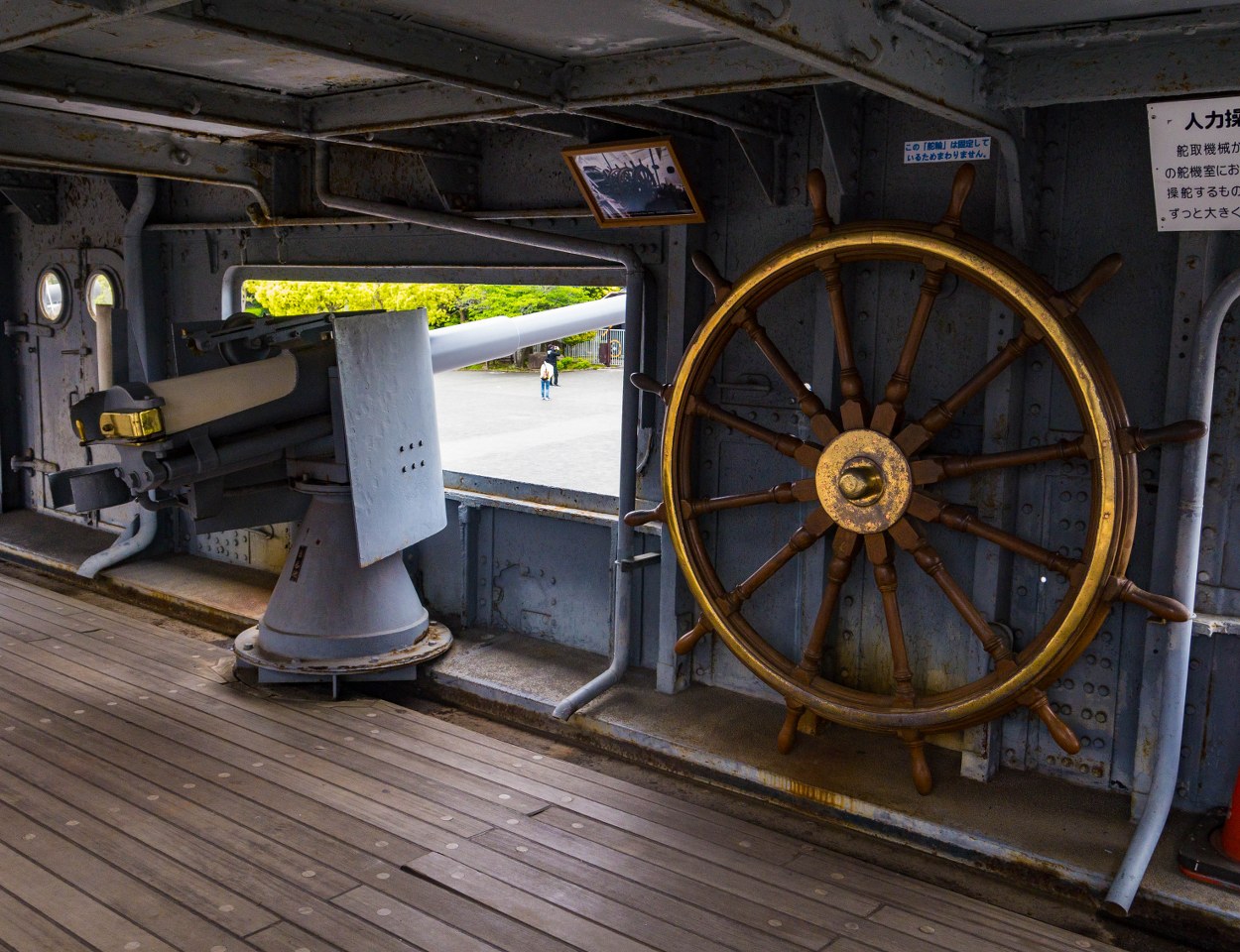 Spacerując po górnym pokładzie najłatwiej zauważyć różnicę pomiędzy oryginalnym i nowszym wyposażeniem. Oba wysokie, charakterystyczne dla predrednotów maszty, kominy czy główna artyleria (305mm) odtworzone są wedle starych planów, sporo części podchodzi tu z chilijskiego pancernika. I wiecie co? Nie ważne, z którego roku dany element pochodzi – liczy się to, że właśnie tak wyglądał oryginalny okręt, i to już 120 lat temu! Robi to piorunujące wrażenie. W wielu miejscach tekowe drewno pokładu jest tym oryginalnym i podczas kluczowej dla wojny z Rosją bitwy przechadzał się po nim admirał Togo. Wszystkie starcia wojny oraz cała historia okrętu przedstawione są na metalowych płytach i są one jedynymi z niewielu gdzie absolutnie przydatna jest znajomość japońskiego.