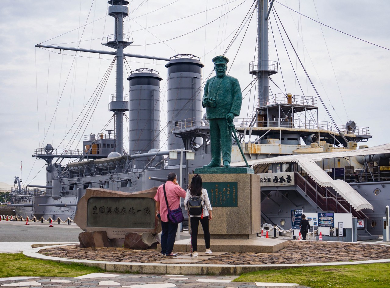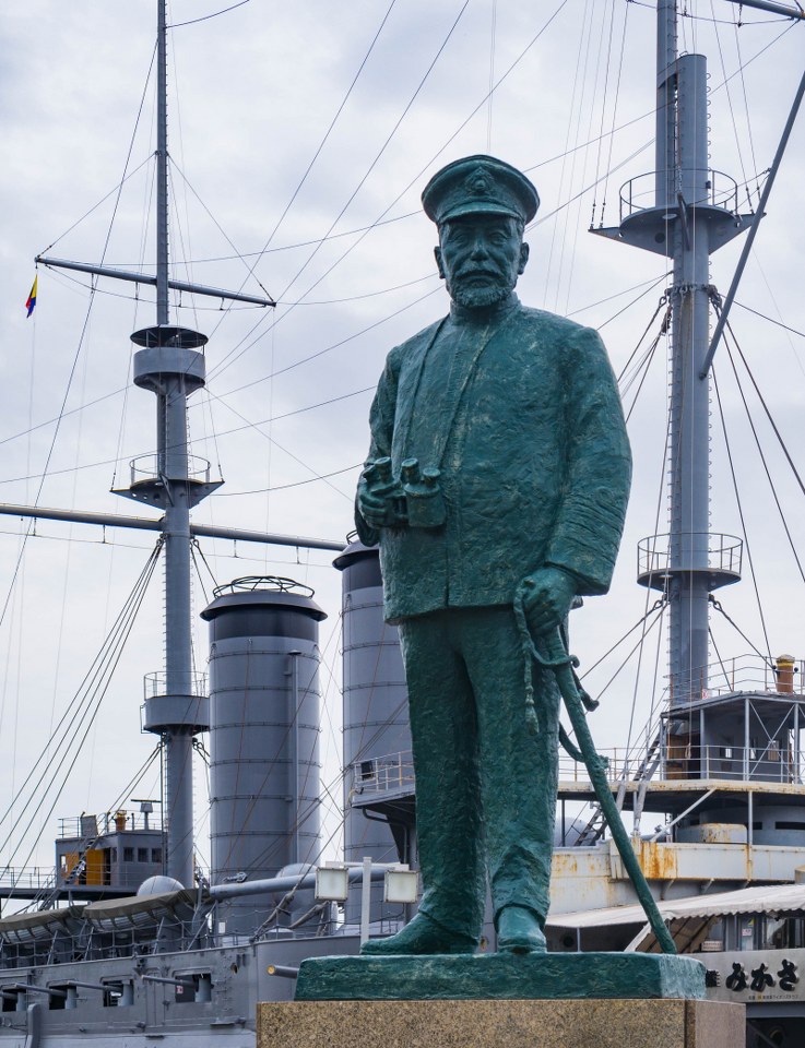 Rozległy plac na skraju Parku Mikasa ma jednego bohatera. Choć nie, dwóch. Pierwszym rzecz jasna jest okręt, któremu zawdzięcza nazwę. Drugi nierozerwalnie związany z pierwszym stoi w centrum placu. Heihachirō Tōgō, postać nietuzinkowa, bohater narodowy, po śmierci wyniesiony nawet do rangi kami, dwukrotnie sportretowany w filmach przez Toshiro Mifune, wybitny strateg, autorytet dla kilku japońskich pokoleń, pierwszy Japończyk na okładce „Timesa”, podczas wojny rosyjsko-japońsko charyzmatyczny dowódca „Mikasy” jak i całej floty. Jego pomnik z brązu jako żywo nawiązuje do słynnego obrazu Tōjō Shōtarō, przedstawiającego admirała i grupę oficerów na pokładzie „Mikasy” w trakcie bitwy pod Cuszimą.