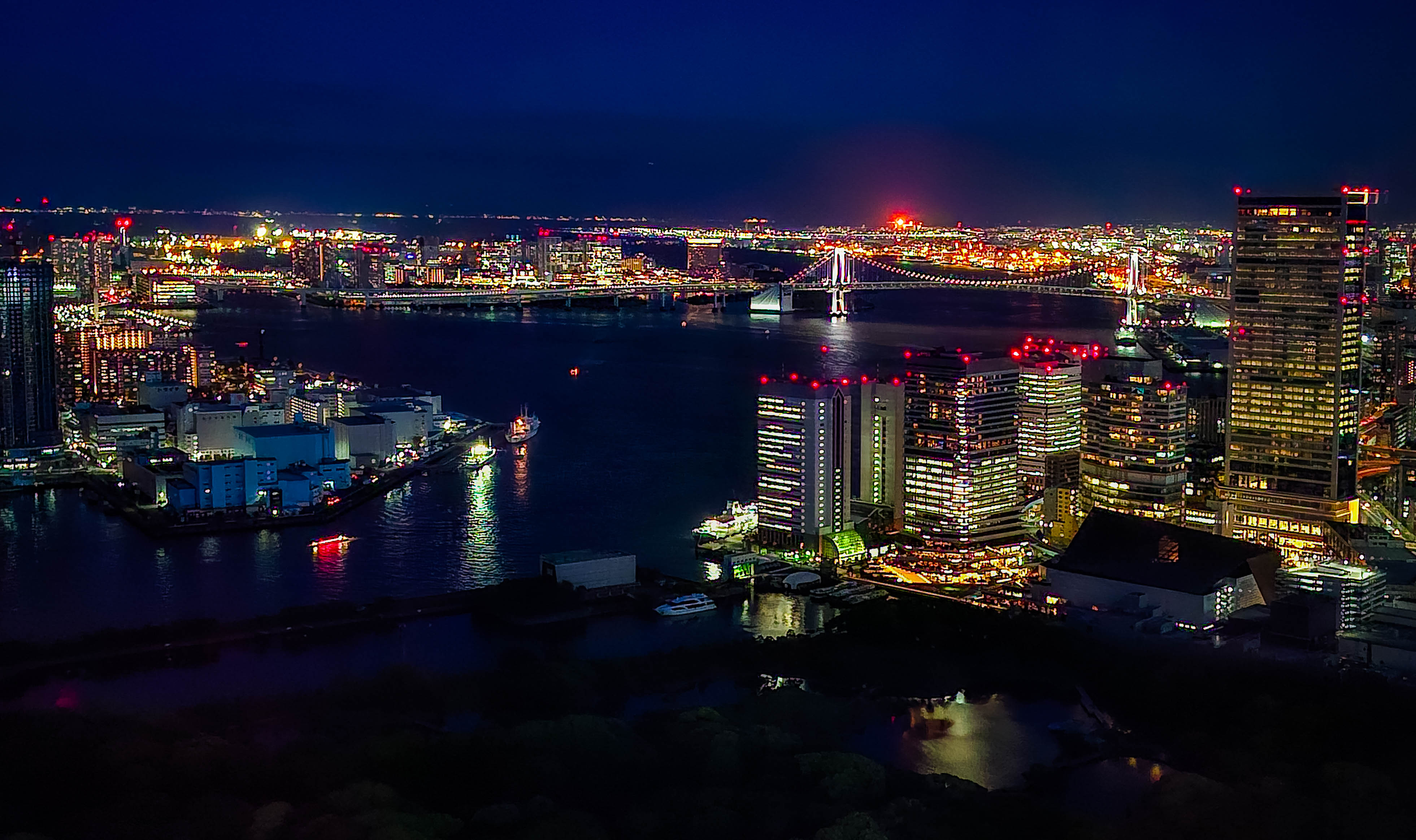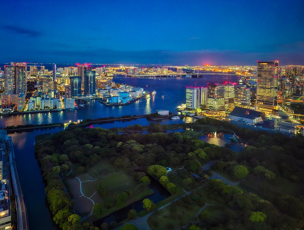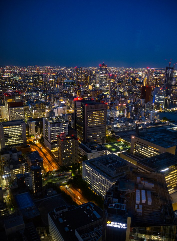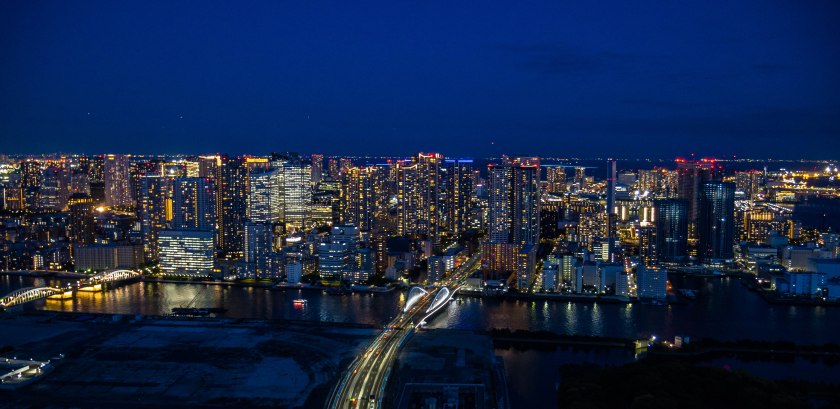 No i kurczę, widoki są fajowe a nocne Tokio z góry prezentuje się zjawiskowo (chyba każde duże miasto tak ma): park Hama-rikyu widzimy z innej perspektywy, czarne wody Sumidy oraz Zatoki Tokijskiej rozlewają się między sztucznymi wyspami a rozświetlone budynki ciągną się w po horyzont. Co ważne: punkt jest co prawda darmowy, ale zaraz obok na tym samym piętrze znajduje się kilka restauracji oferujących (o ile obsługa zaproponuje wam odpowiedni stolik) podobne widoki, wzbogacone o małe co nieco – szybkie sprawdzenie na google i tabelog potwierdza, że jedzonko jest dobre i wcale nie musi być drogie. Tak punkt widokowy, jak i restauracje otwarte są do godziny. 23.00.