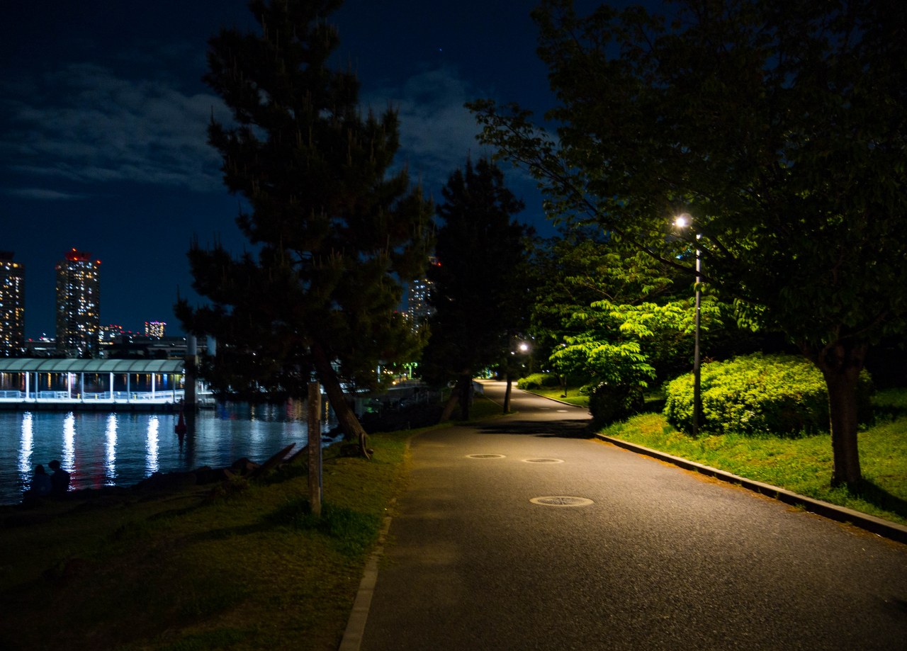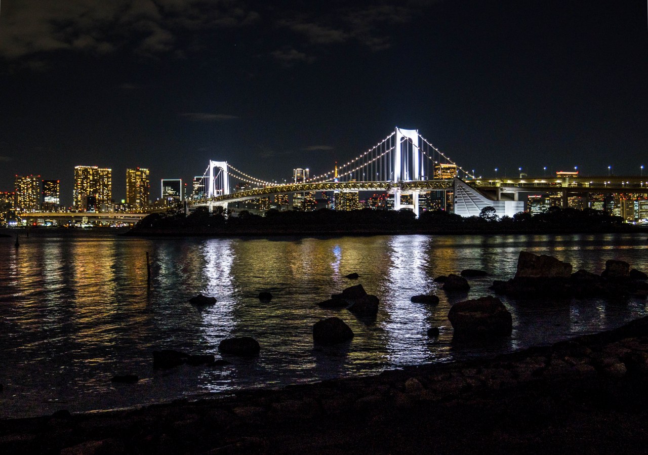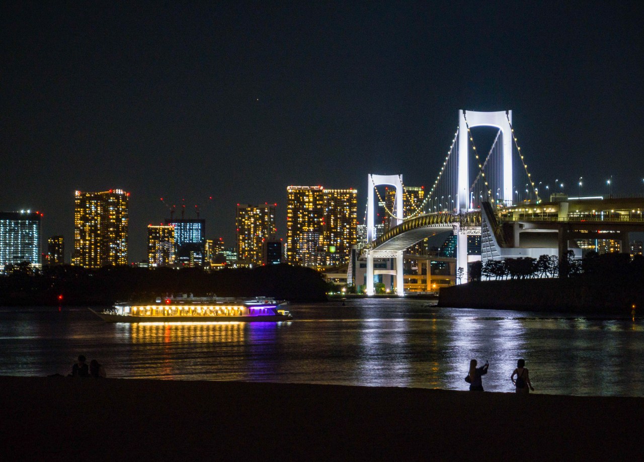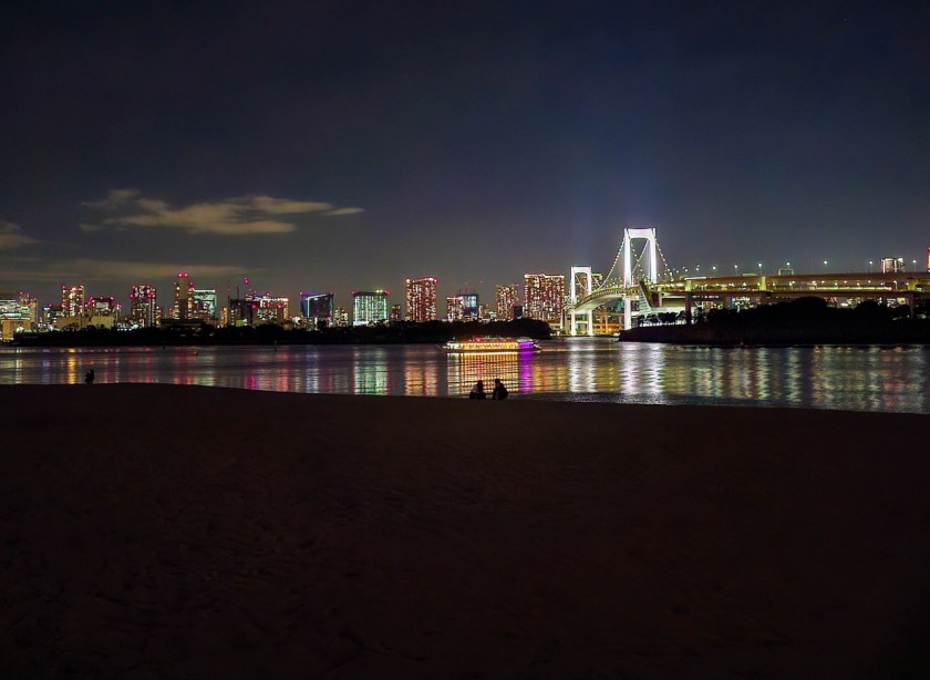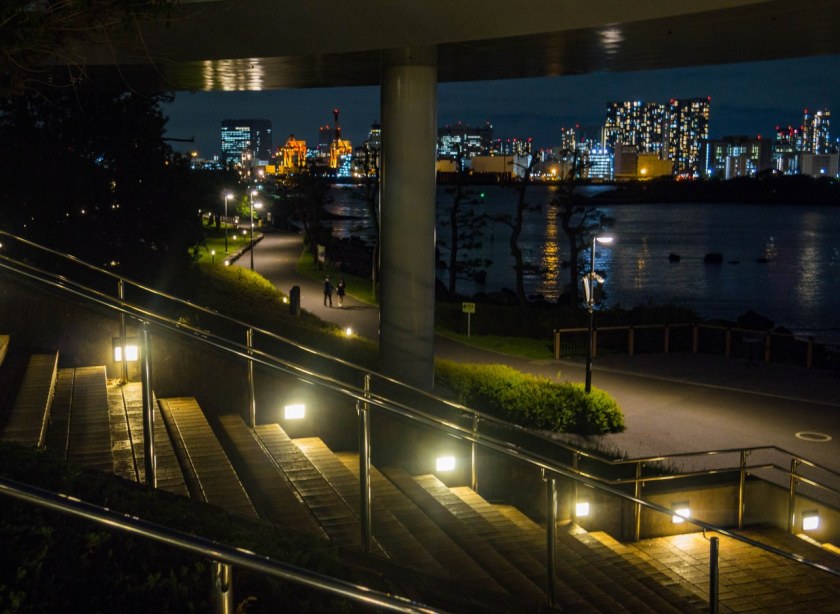 Dla mnie Odaiba była idealnym miejscem na zakończenie dnia i najlepszym co miała do zaoferowania była nocna panorama Tokio. Tak, spacer po jedynej pełnoprawnej stołecznej plaży daje kapitalny widok na miasto – podświetlony Rainbow Bridge zgrania dla siebie najwięcej uwagi, ale cały mieniący się kolorami drugi plan robią robotę. Parki Daiba, Odaiba Seaside oraz Shiokaze (wraz z biegnącą równolegle promenadą) ciągną się na długości ponad dwóch kilometrów i jeśli przyjdzie wam do głowy – jak mi – odpuścić sobie pierwszy z nich to klepnijcie się w czoło. Park Daiba, będący de facto jedną z pozostałością po dawnych bateriach daje chyba najfajniejsze spojrzenie na Odaibę i to, że z niego zrezygnowałem boli mnie do dziś 🙂 Na szczęście plaża i promenada wzdłuż Odaiba Seaside Park nie odstają zbytnio, oferując najlepsze nocne spojrzenie na „miasto główne”. A sądząc po ilości par jest to idealne miejsce na romantyczny wieczorny spacer.