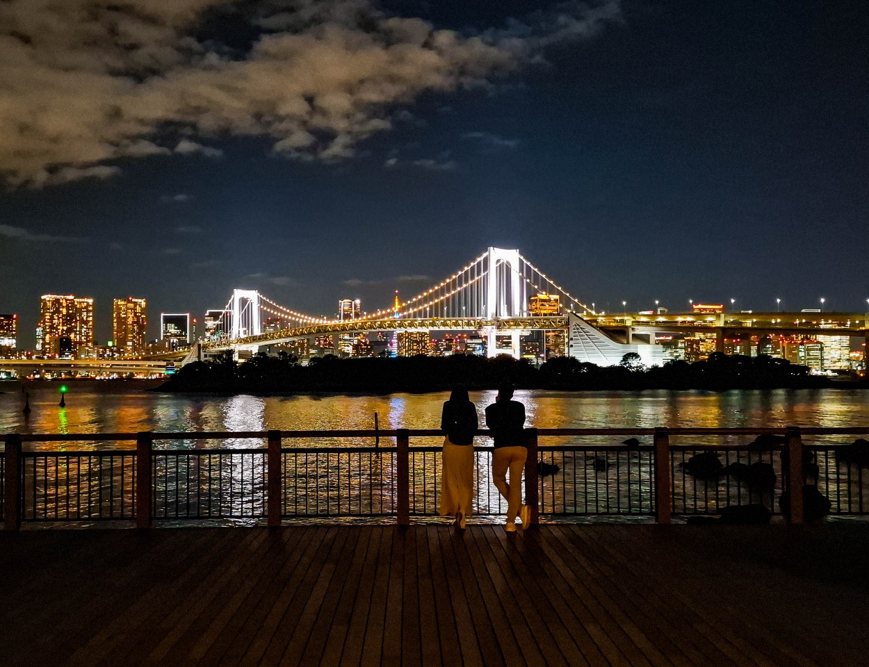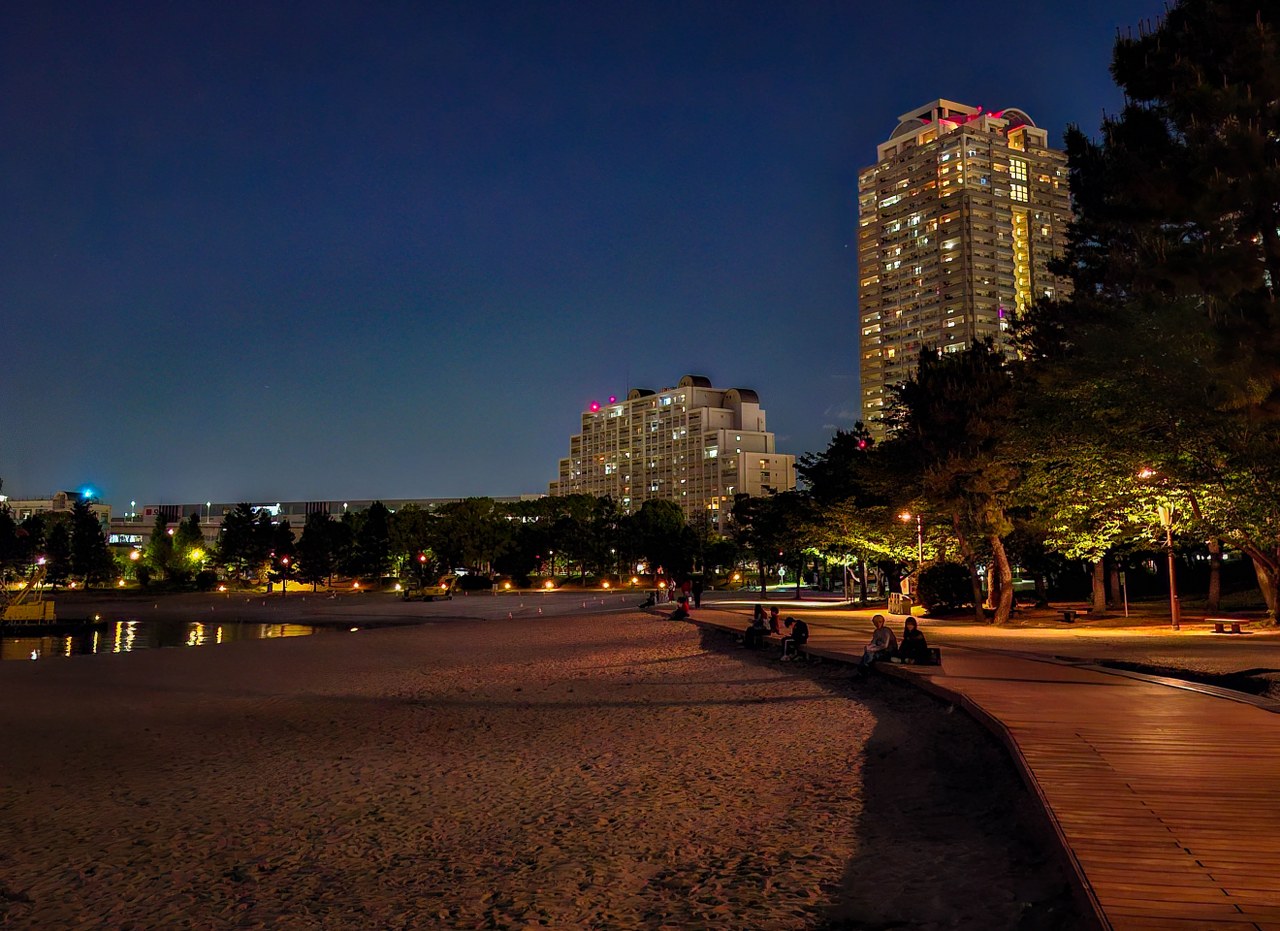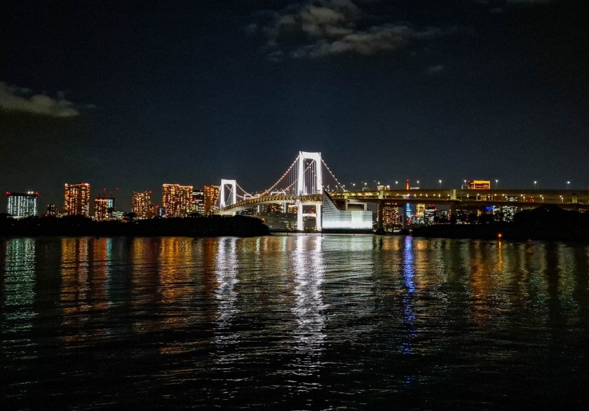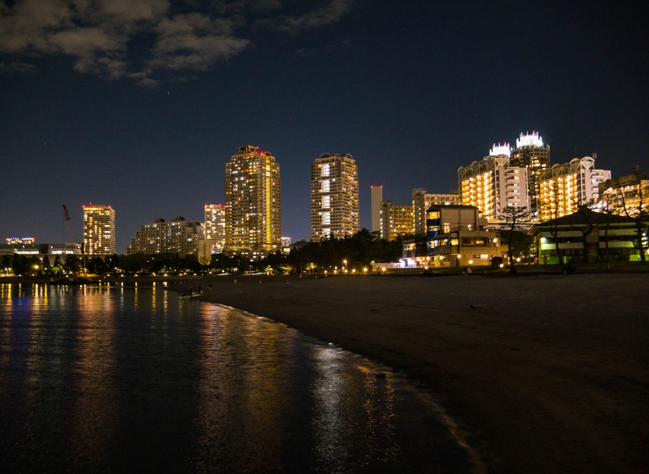 Dla mnie Odaiba była idealnym miejscem na zakończenie dnia i najlepszym co miała do zaoferowania była nocna panorama Tokio. Tak, spacer po jedynej pełnoprawnej stołecznej plaży daje kapitalny widok na miasto – podświetlony Rainbow Bridge zgrania dla siebie najwięcej uwagi, ale cały mieniący się kolorami drugi plan robią robotę. Parki Daiba, Odaiba Seaside oraz Shiokaze (wraz z biegnącą równolegle promenadą) ciągną się na długości ponad dwóch kilometrów i jeśli przyjdzie wam do głowy – jak mi – odpuścić sobie pierwszy z nich to klepnijcie się w czoło. Park Daiba, będący de facto jedną z pozostałością po dawnych bateriach daje chyba najfajniejsze spojrzenie na Odaibę i to, że z niego zrezygnowałem boli mnie do dziś 🙂 Na szczęście plaża i promenada wzdłuż Odaiba Seaside Park nie odstają zbytnio, oferując najlepsze nocne spojrzenie na „miasto główne”. A sądząc po ilości par jest to idealne miejsce na romantyczny wieczorny spacer.