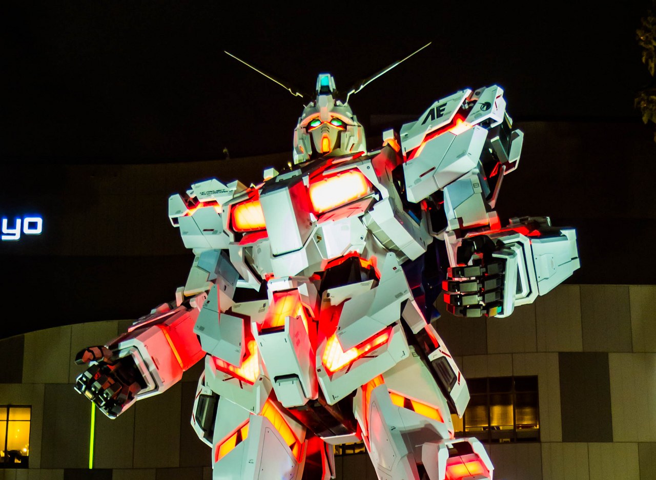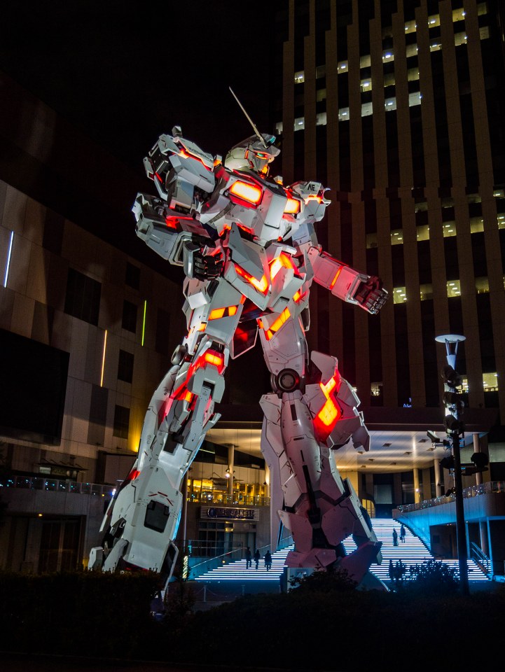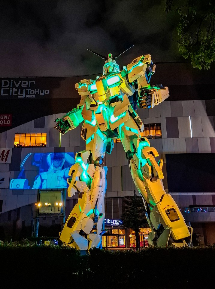 Dokładnie 5 minut spaceru dalej traficie na coś z japońską popkulturą i anime nierozerwalnie związanego, wielkiego mecha, który o określonych godzinach przerywa statyczne i dumne trwanie w jednej pozie i zaczyna kilkuminutowe show. Nie jest to co prawda pokaz dynamiczny a bardziej bawiący się światłem i muzyką, ale robi wrażenie.