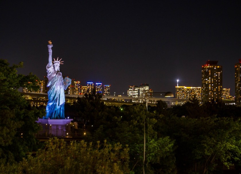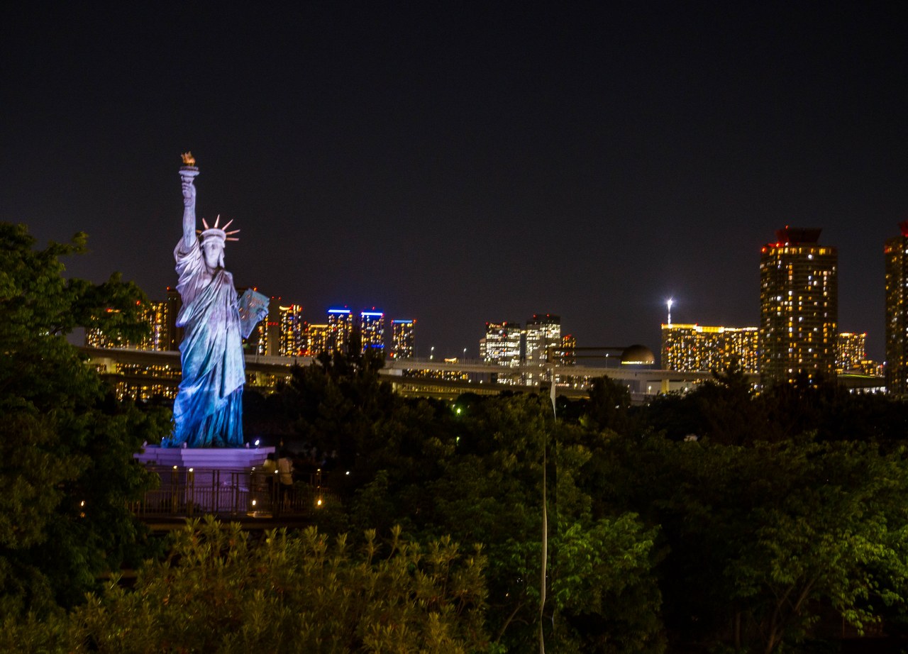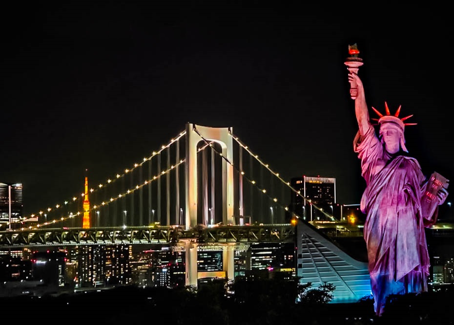 Historia japońskiej Statuy Wolności jest ciekawa i sięga przełomu lat 1998 i 99 kiedy to z okazji „roku francuskiego” na Odaibie tymczasowo „zainstalowano” replikę Statuy z paryskiej wyspy Ile aus Cygnes. Jak się okazało stałą się ona tak popularna, że niedługo po jej powrocie do Francji powstała jej kopia i ona już na stałe na sztucznej wyspie zamieszkała. I tak sobie stoi do dziś, tworząc z tokijską panoramą urokliwy widok dając namiastkę tego co czeka za Oceanem Atlantyckim. Co ciekawe wysoka na 12 metrów statua nie jest najwyższą w Japonii. Czy warto odstać swoje by zrobić zdjęcie nie tylko Statuy, ale i Tęczowego Mostu na jej tle? Absolutnie. Choć punktów, z których można zrobić jej zdjęcie jest więcej i warto pochodzić tu i ówdzie.