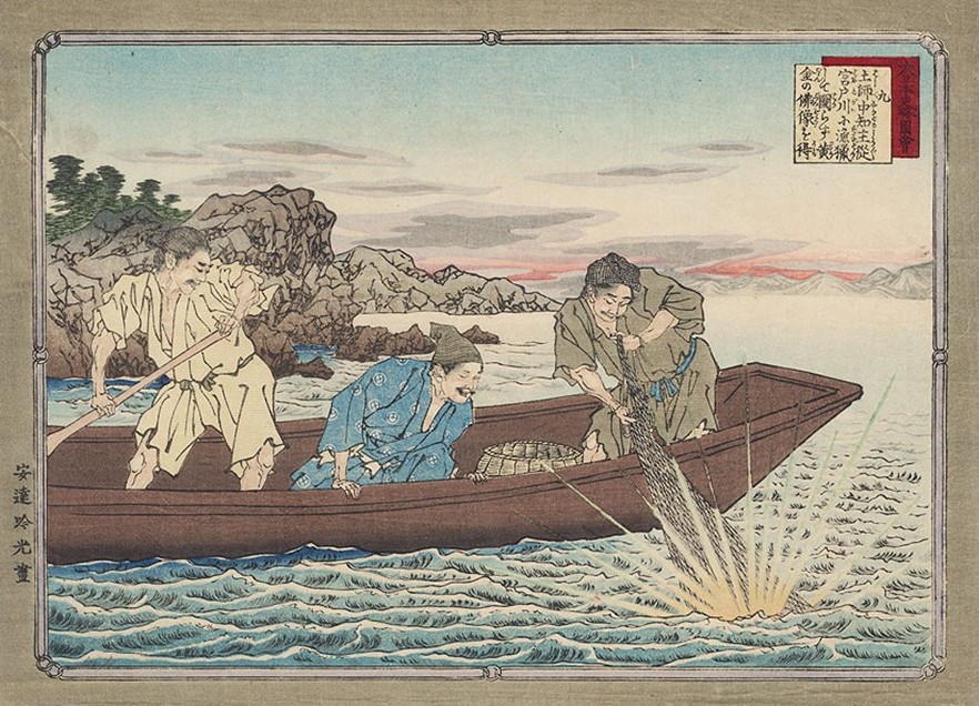 Na jednej z nich, Miyato dwóch braci podczas połowu, zamiast ryb znalazło w sieci niewielką rzeźbę. Nie zrobiła ona na nich wrażenia więc czym prędzej ją wyrzucili. Ta jednak była bardzo nieustępliwa i ponownie znalazła drogę do ich sieci. Bracia z kolei, już z większą irytacją ponownie ją wyrzucili. I tak jeszcze razy kilka… aż w końcu dali za wygraną i wzięli ją do wioski. Tam fachowym okiem spojrzał na nią ich mentor, doznając oświecenia dostrzegł w niej boginię miłosierdzia Kannon, przede wszystkim jednak wysnuł tezę, że jej odnalezienie było znakiem wobec, którego nie można przejść obojętnie. Dlatego też mieszkańcom wioski polecił słać do rzeźby modlitwy a sam, czym prędzej urządził dla niej kaplicę. W swoim domu. Jednocześnie – jakby komuś w naszej legendzie brakowało dalszych elementów fantastycznych – jednej nocy z niebios zejść miał złoty smok (dlatego pełna nazwa świątyni to Kinryūzan Sensō-ji) a w sąsiedztwie wyrosnąć miało tysiąc sosen! Sama rzeźba szybko zyskała sławę odpowiadającej na kierowane doń modlitwy, kilkanaście lat później kapliczkę rozbudowano a na opiekującego się świętym miejscem mnicha zesłany został sen, zgodnie z którym rzeźbę schowano w wewnętrznym sanktuarium, postanawiając nigdy już nie pokazywać jej publicznie.